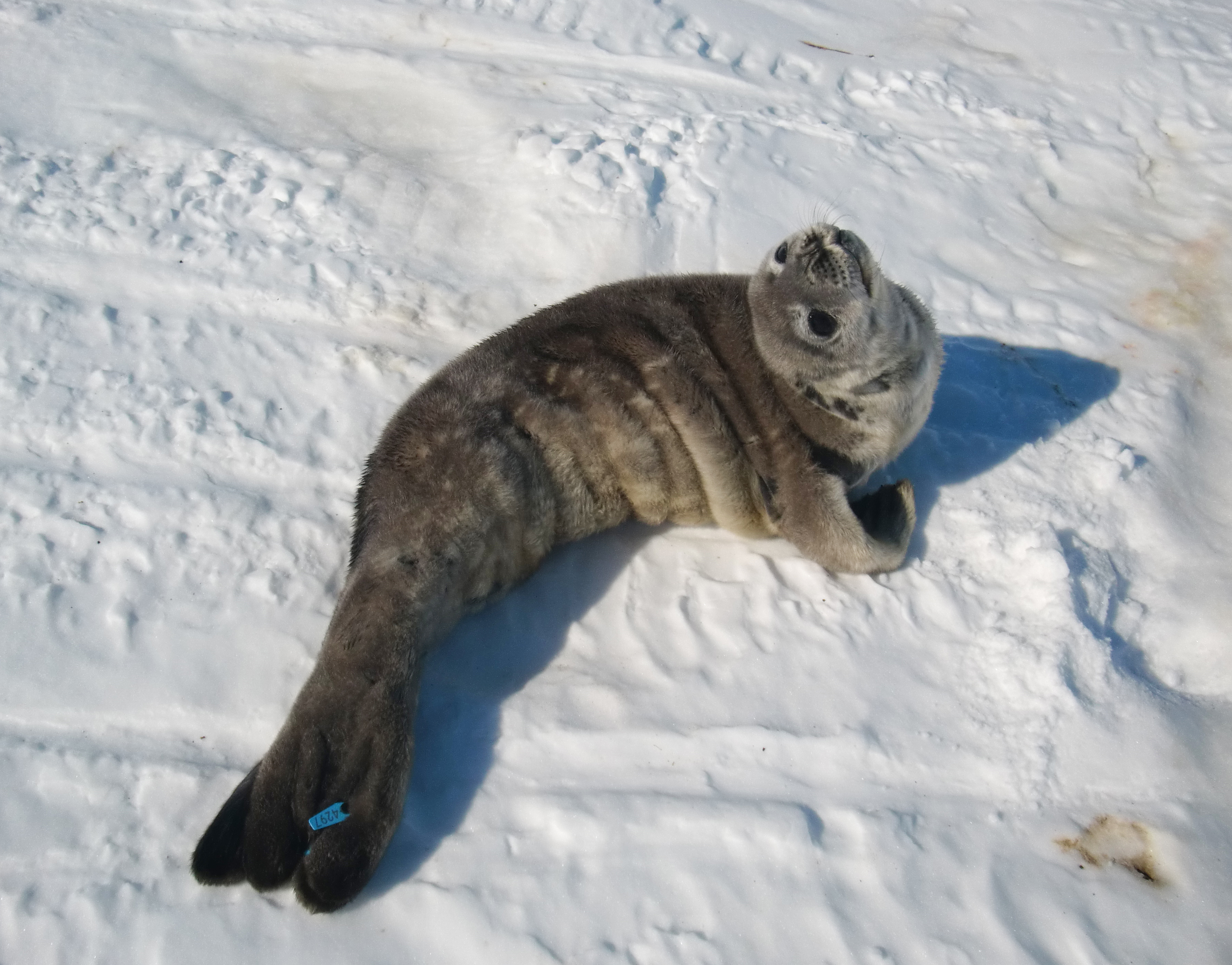 A young Weddell seal pup looks back at Alex Eilers as she takes a photo. Out on the sea ice near McMurdo Station, Antarctica.