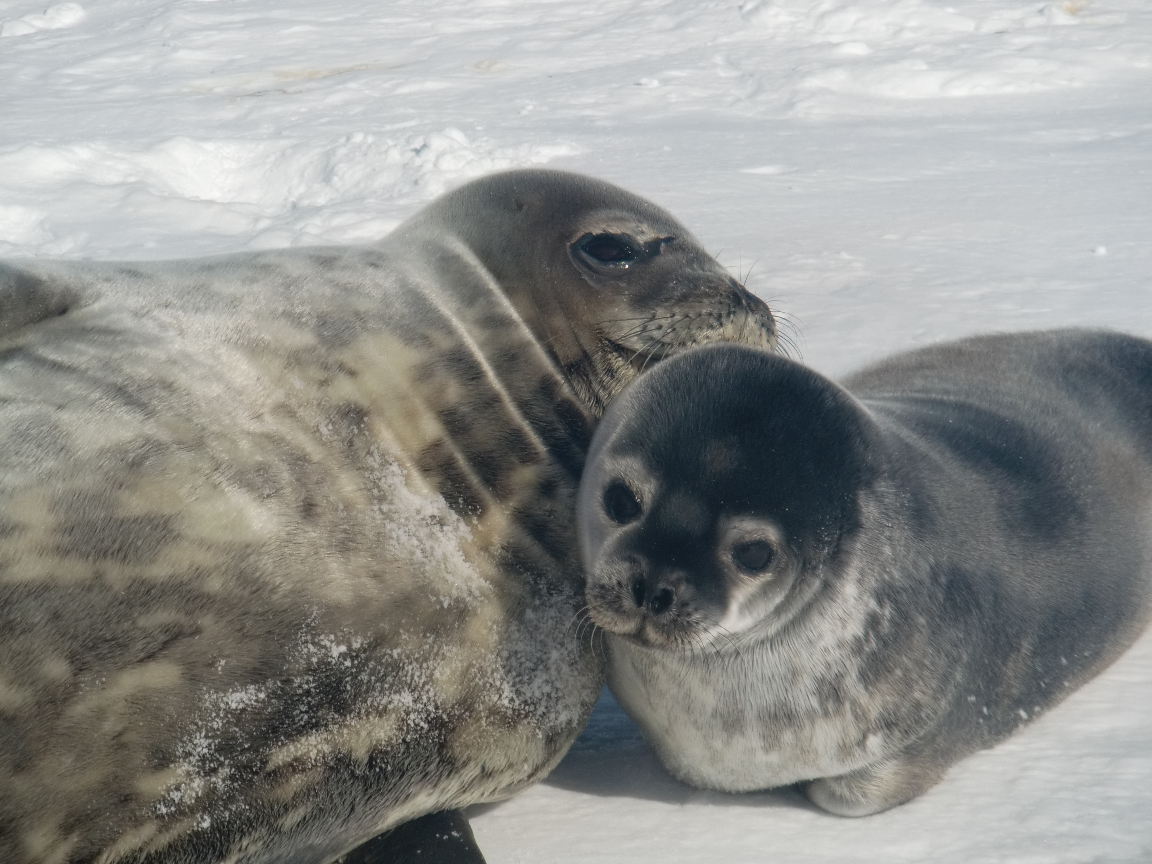 A Weddell seal and pup out on the sea ice near McMurdo Station, Antarctica.
