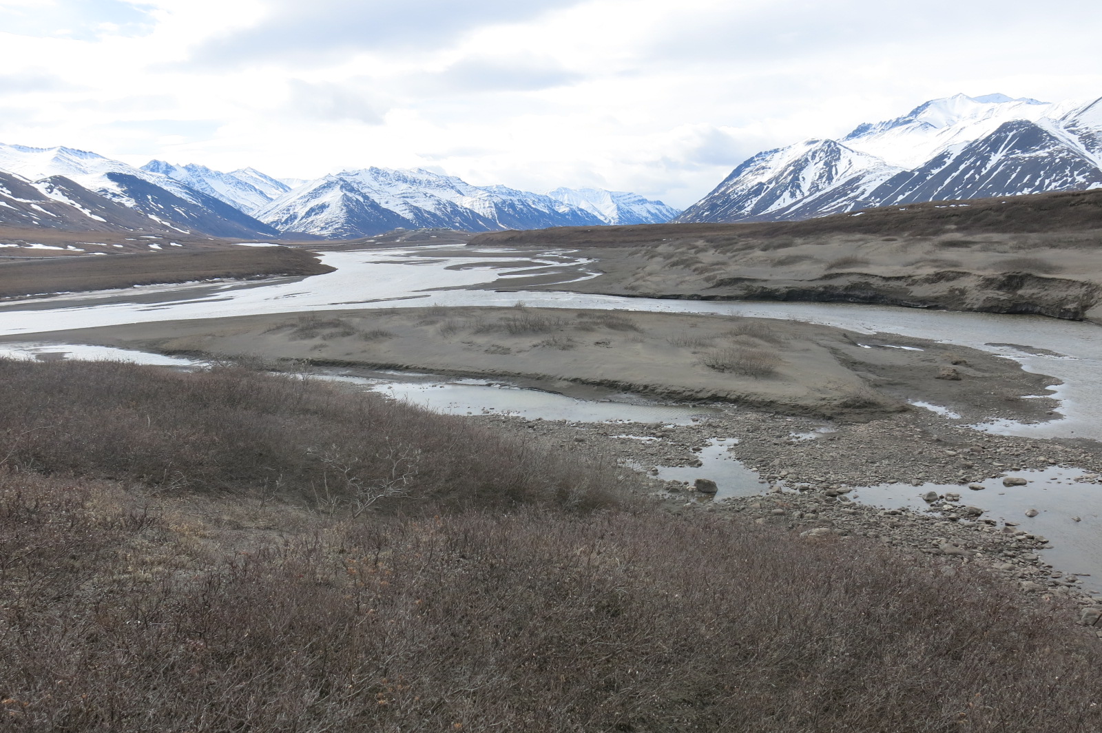 A river runs thorugh the tundra, with the Brooks Range in the background. Dalton Highway, Alaska.