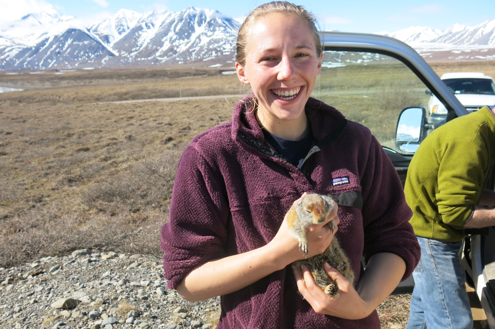 Kate Wilsterman holds a sedated Arctic ground squirrel at Toolik Field Station, Alaska.