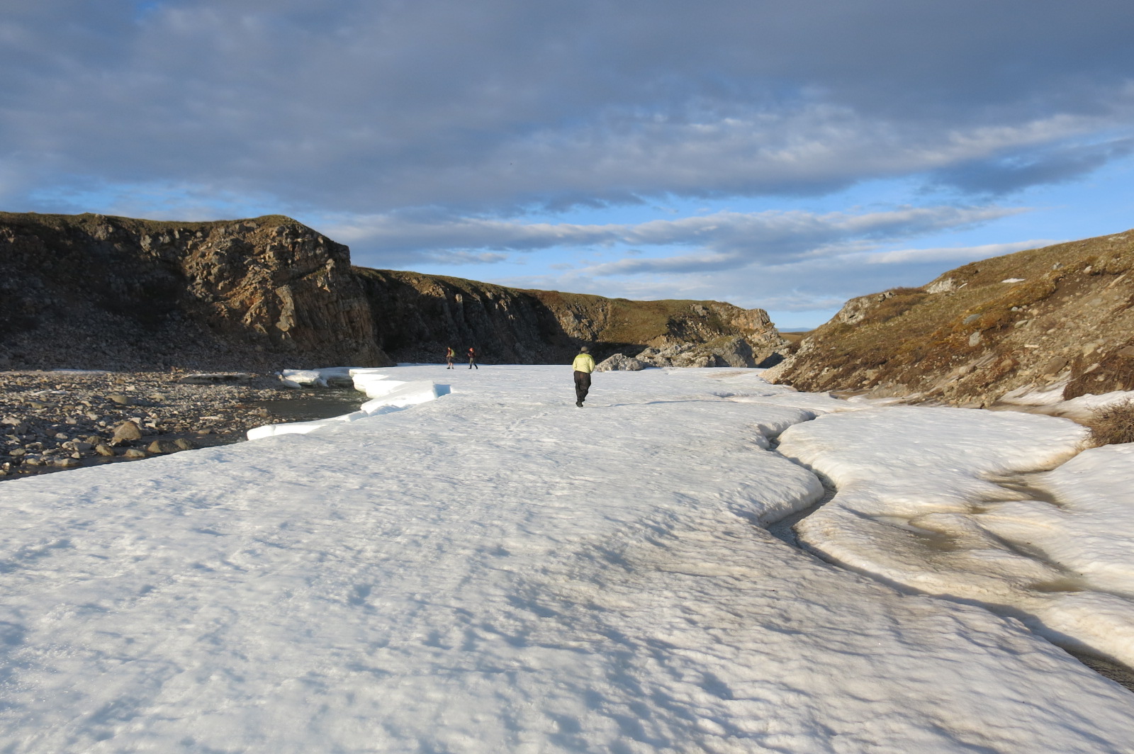 Team Squirrel hikes along on top of an aufeis ice formation near Toolik Field Station, Alaska.