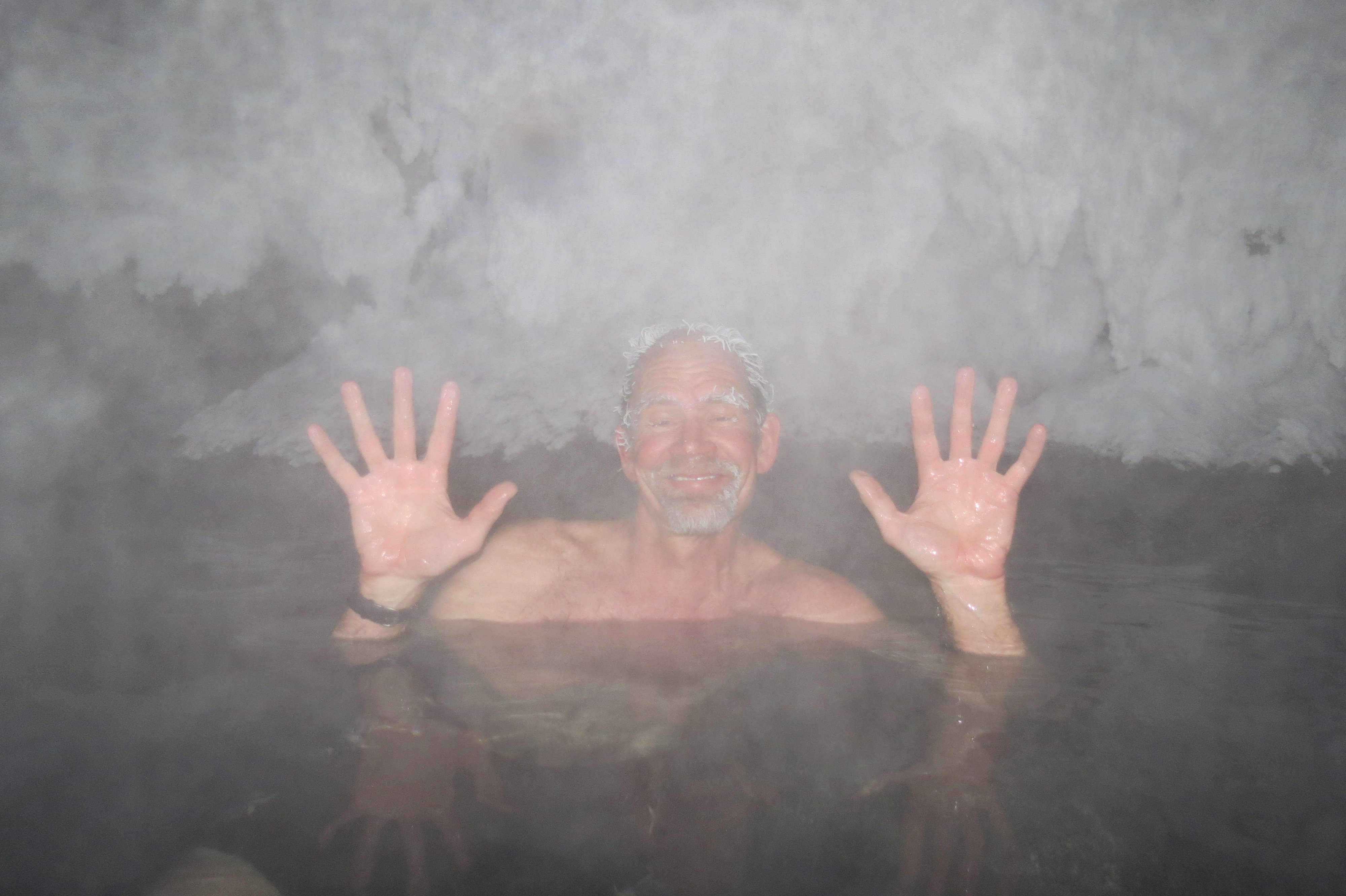 Andre Wille is covered in frost, but staying warm, at Chena Hot Springs, Alaska.