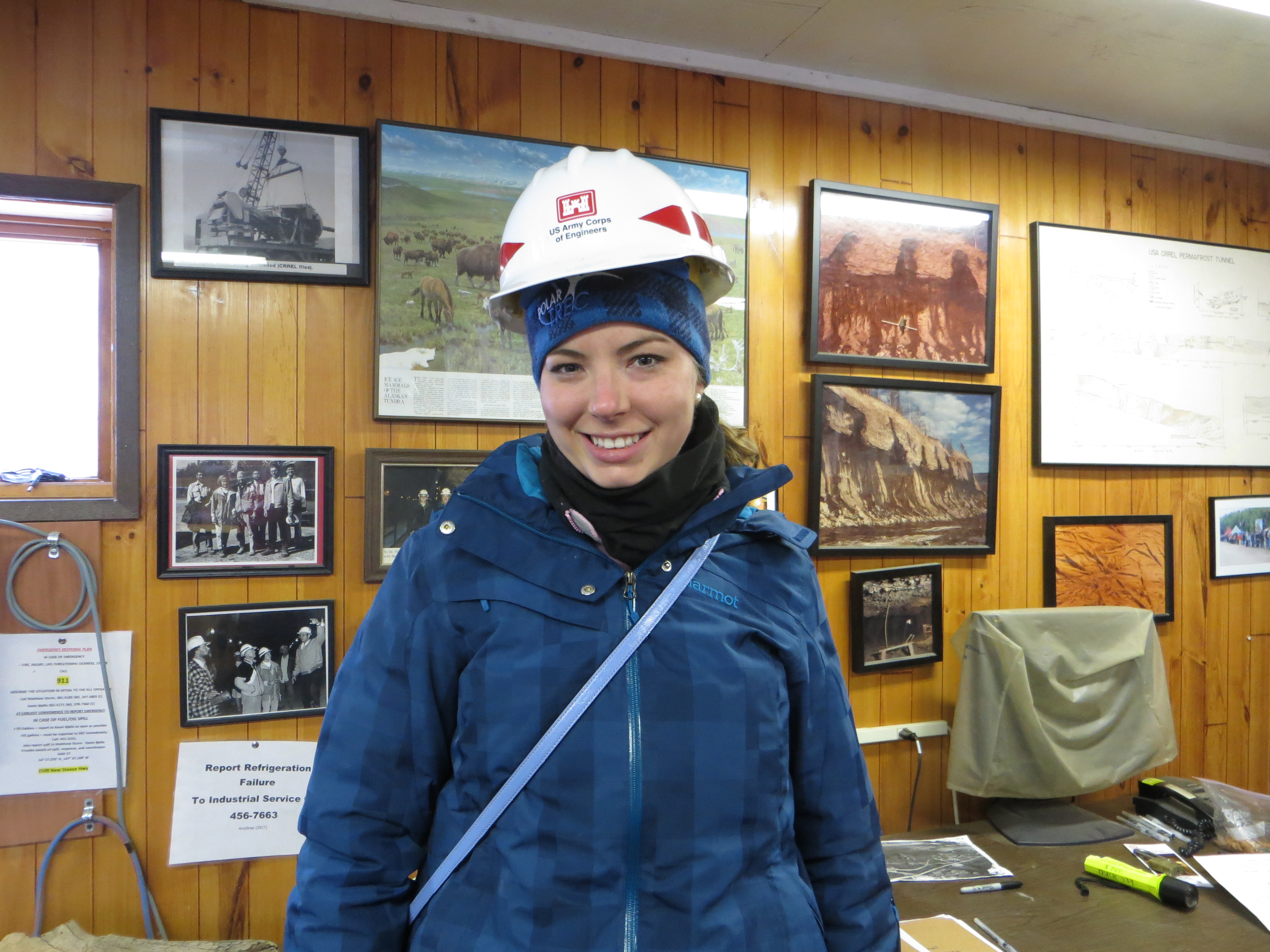 Emily Dodson has her hard hat on in preparation of going down into the CRREL Permafrost Tunnel in Fox, Alaska.