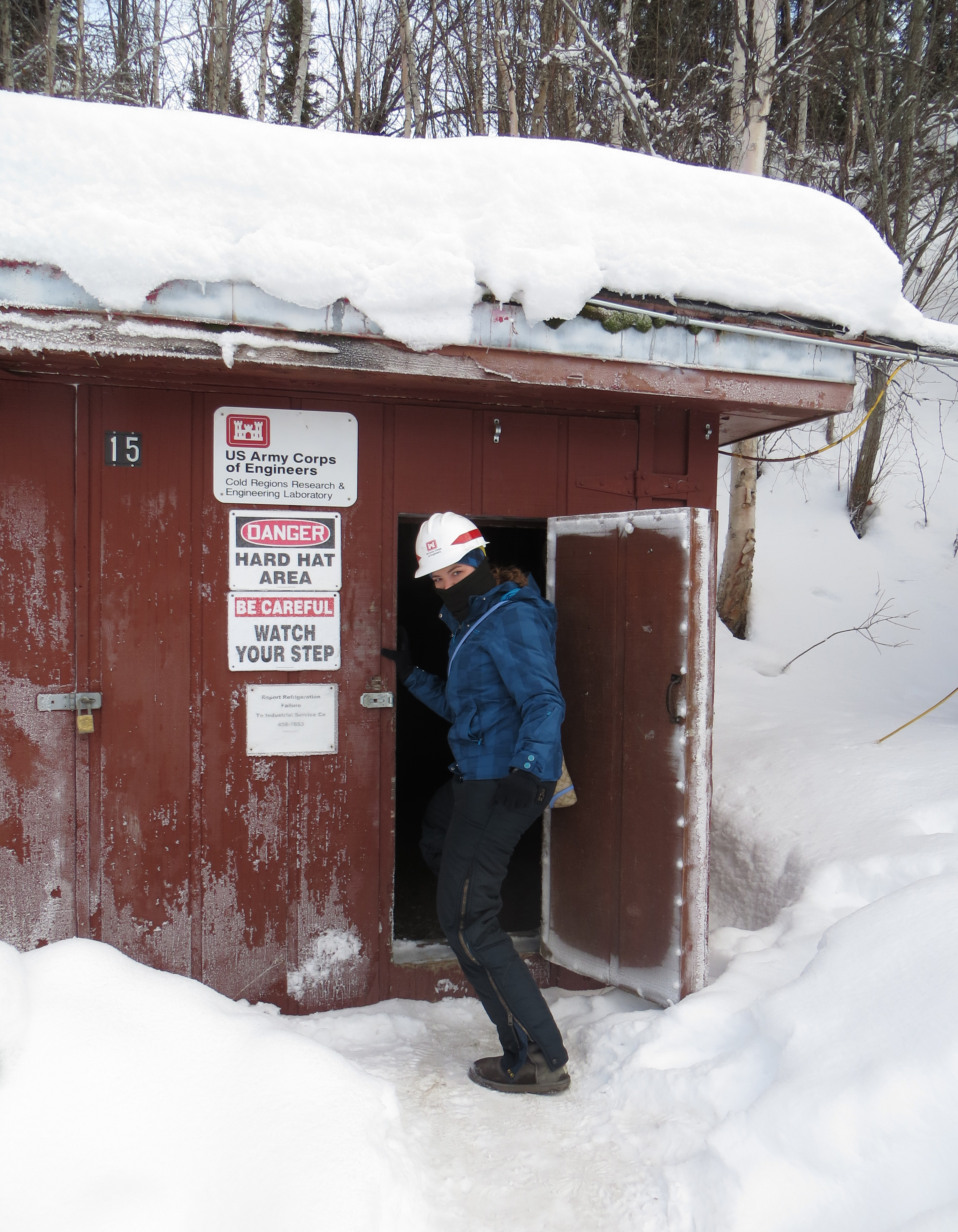 Emily Dodson at the entrance of the building which leads down into the CRREL Permafrost Tunnel in Fox, Alaska.