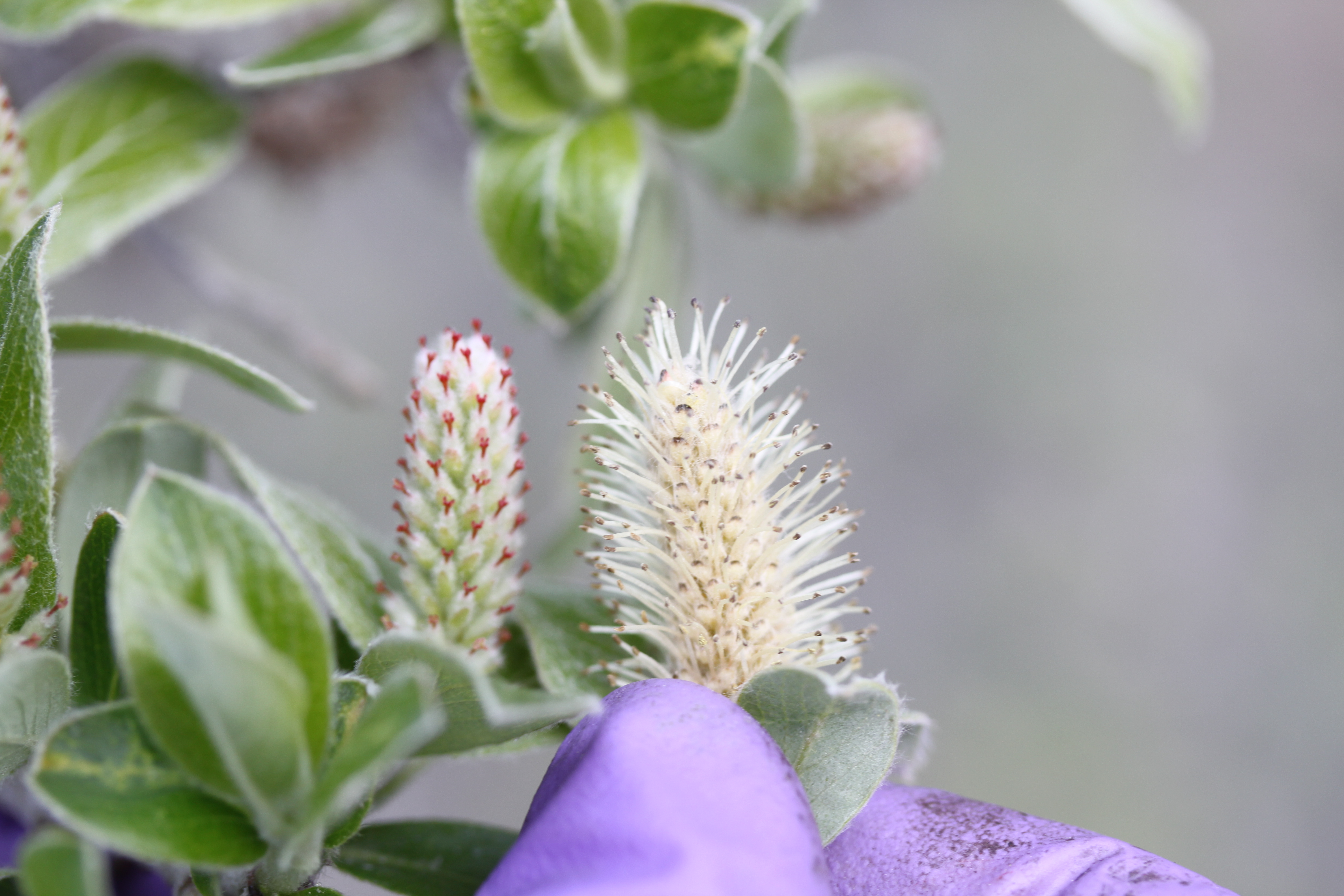 The male and female catkin of a Salix glauca (gray leaf willow) bush. The female is on the left and is more smooth with red tips. The male is on the right and is bushy with yellow (pollen) tips. Outside of Kangerlussuaq, Greenland.