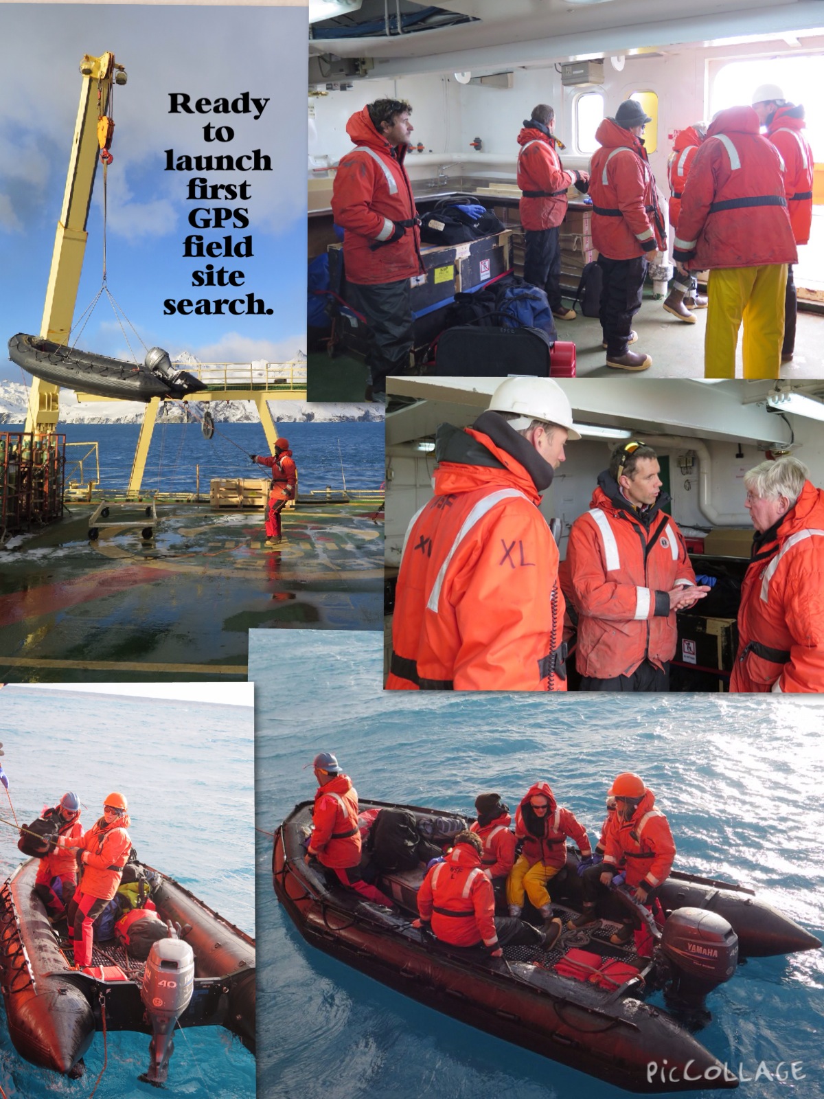 After arriving on station, key members of the science party head out on a zodiac to scout out a GPS station location. Aboard the R/V Nathaniel B. Palmer icebreaker at South Georgia Island.