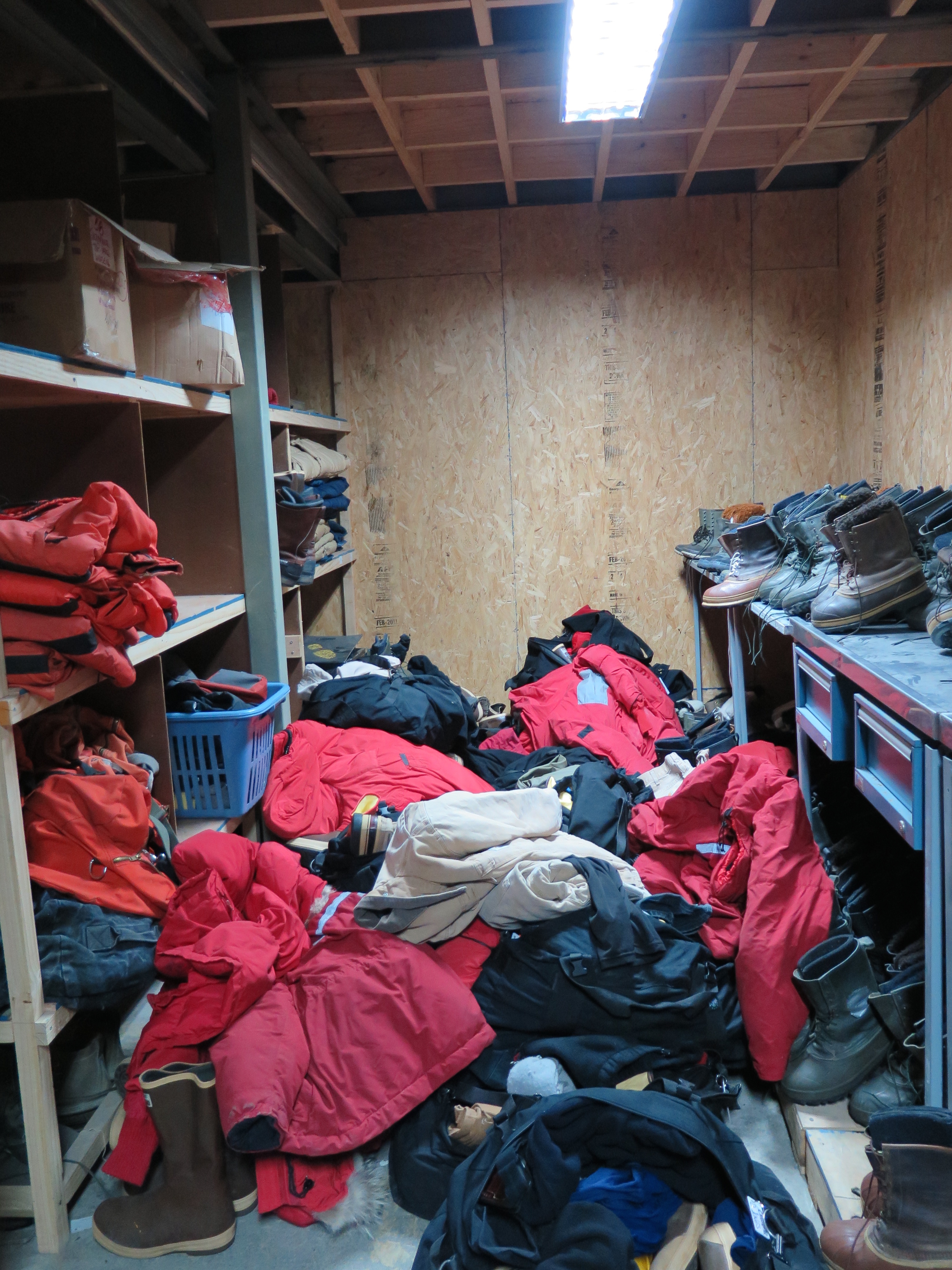 A pile of returned cold weather gear at the clothes depot at the Antarctic Support Services. This pile came off the previous vessel – Jillian and the team will get their clothes from a different, clean section. Punta Arenas, Chile.