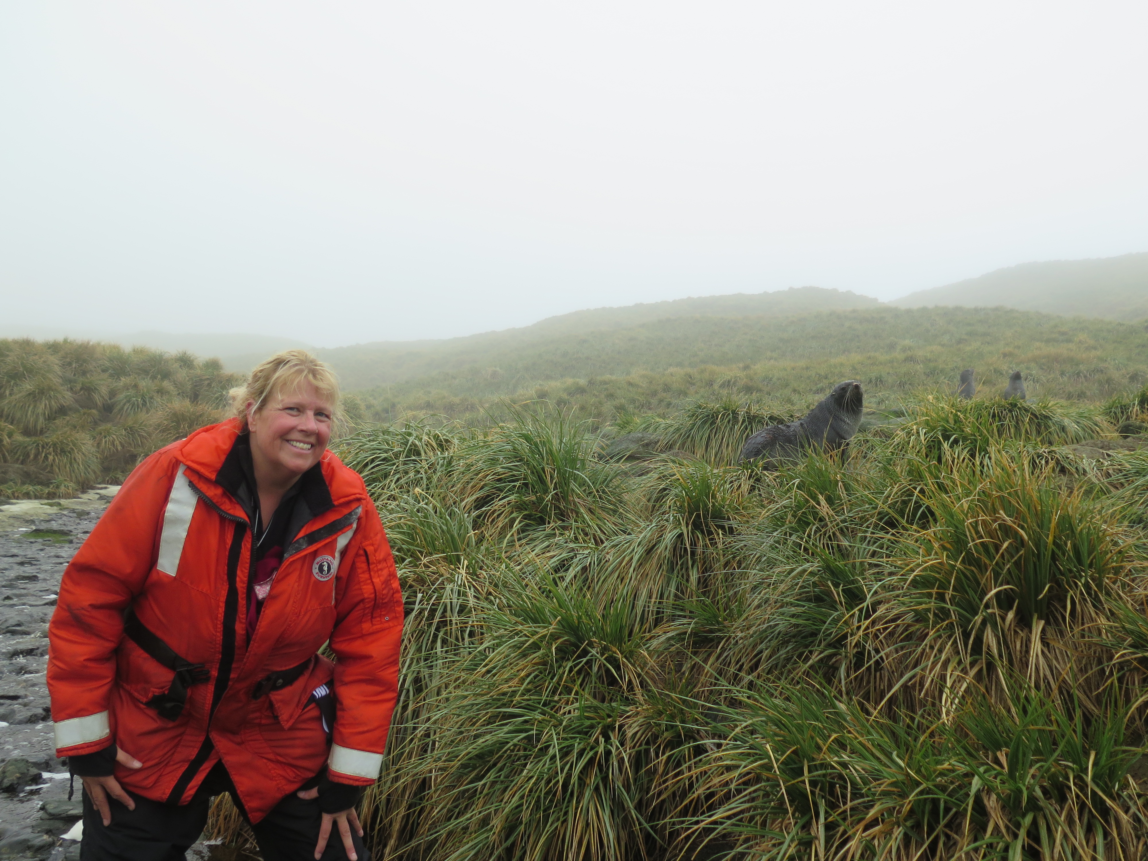 Jillian Worssam near some fur seals on Bird Island, South Georgia.