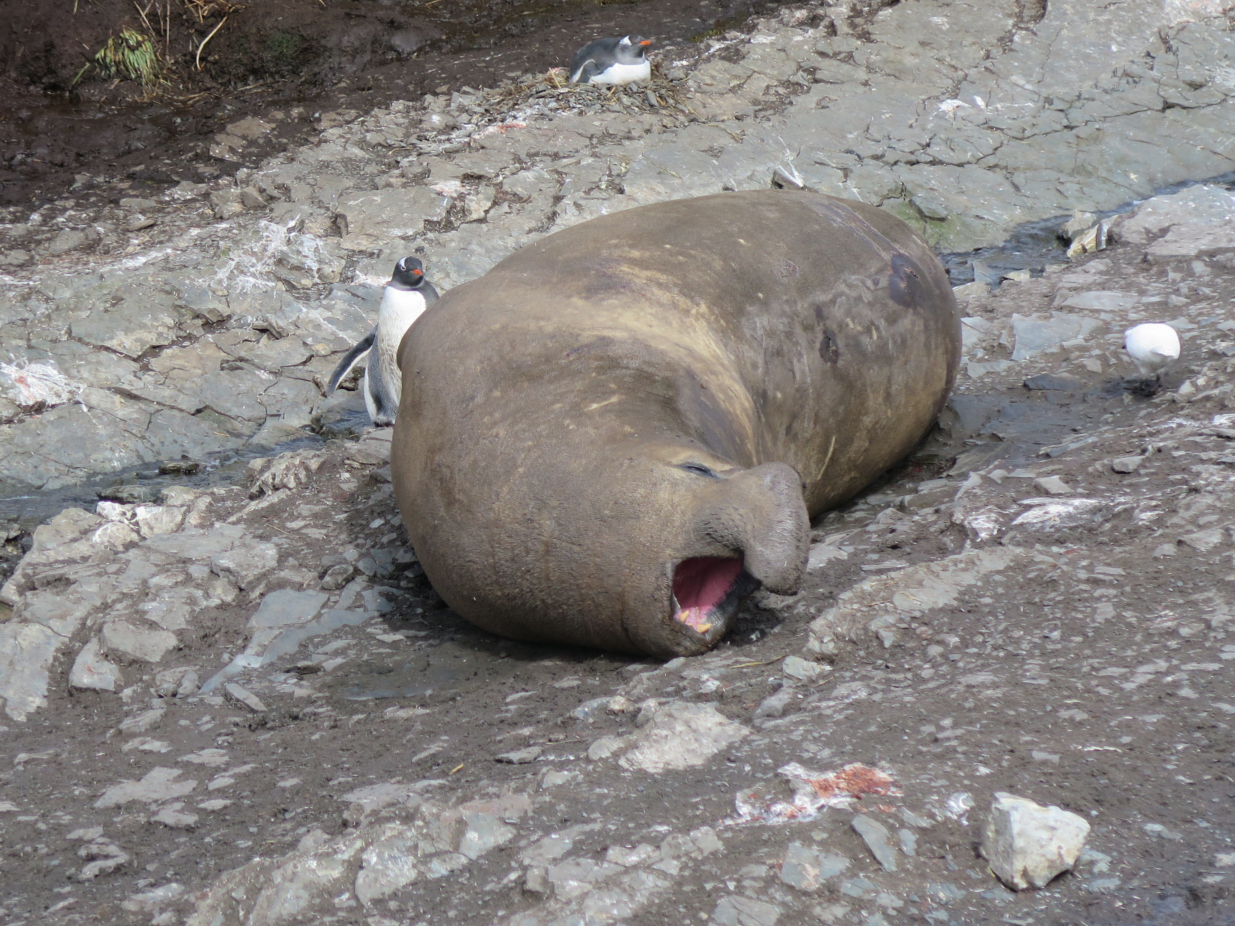 An elephant seal on a beach on Annenkov Island, South Georgia.