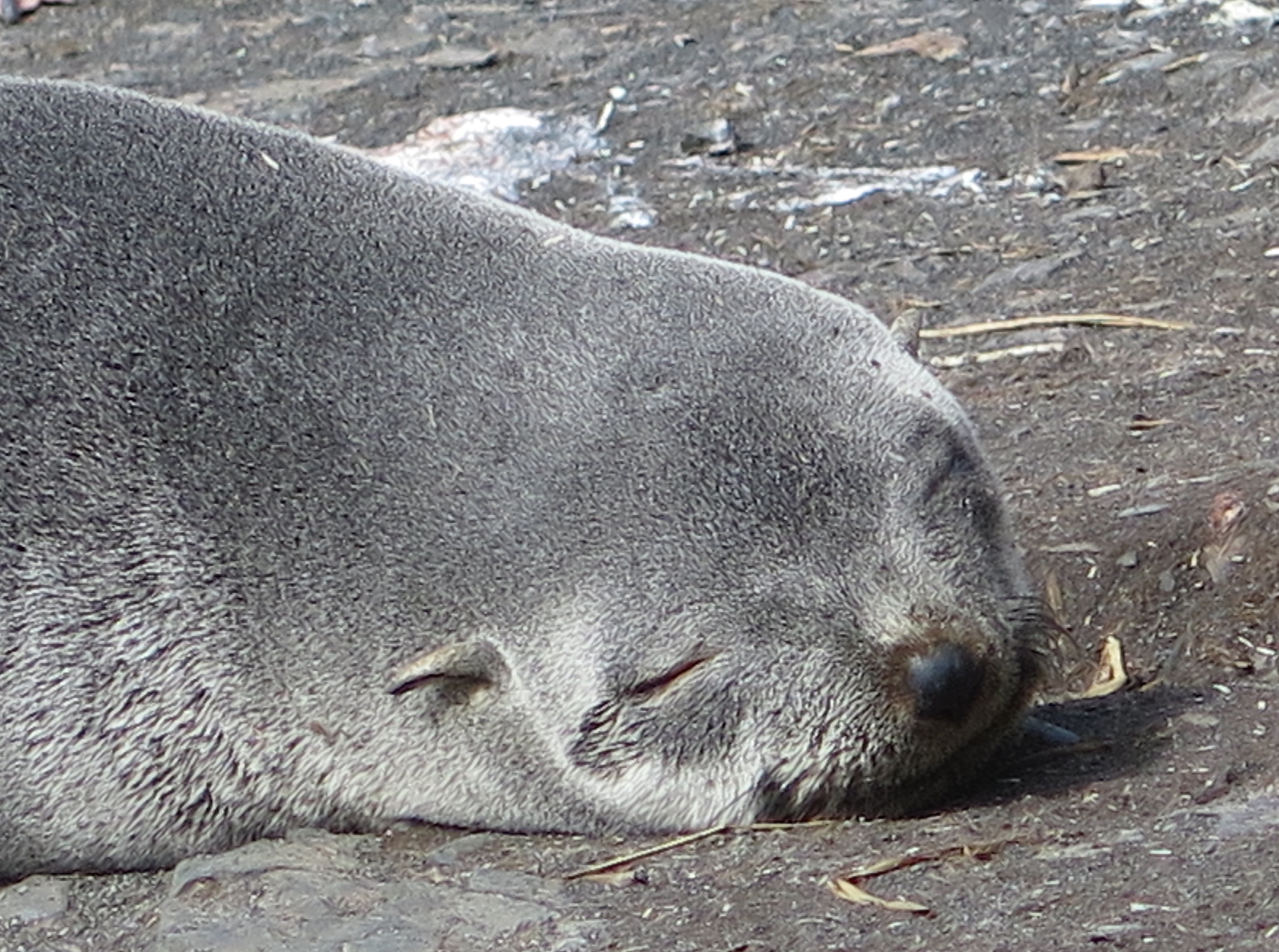 Sleeping on the beach, notice the distinctive ears of this Antarctic fur seal. Bird Island, South Georgia.