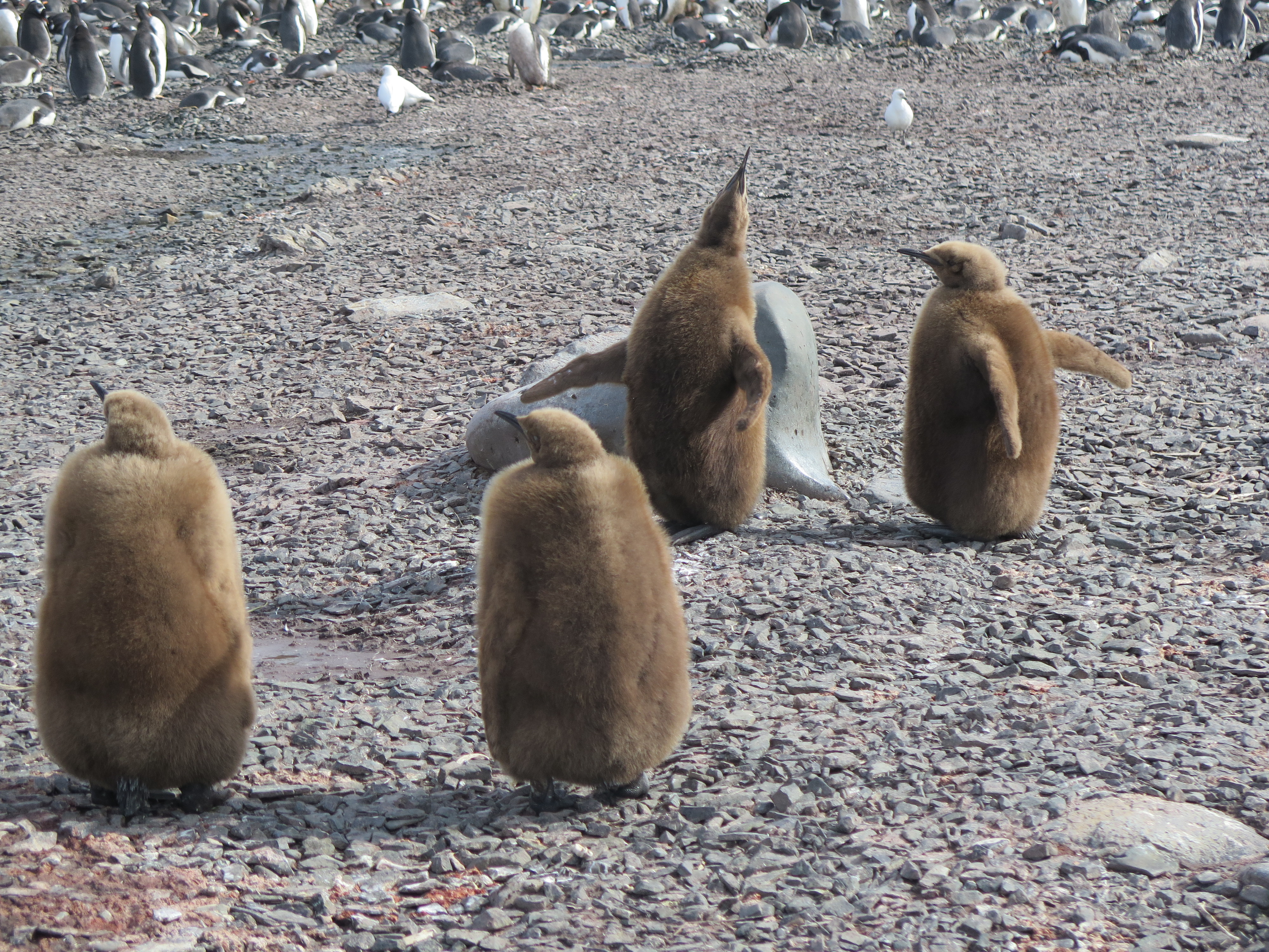 King penguin chicks hang out on a beach on Annenkov Island, South Georgia.