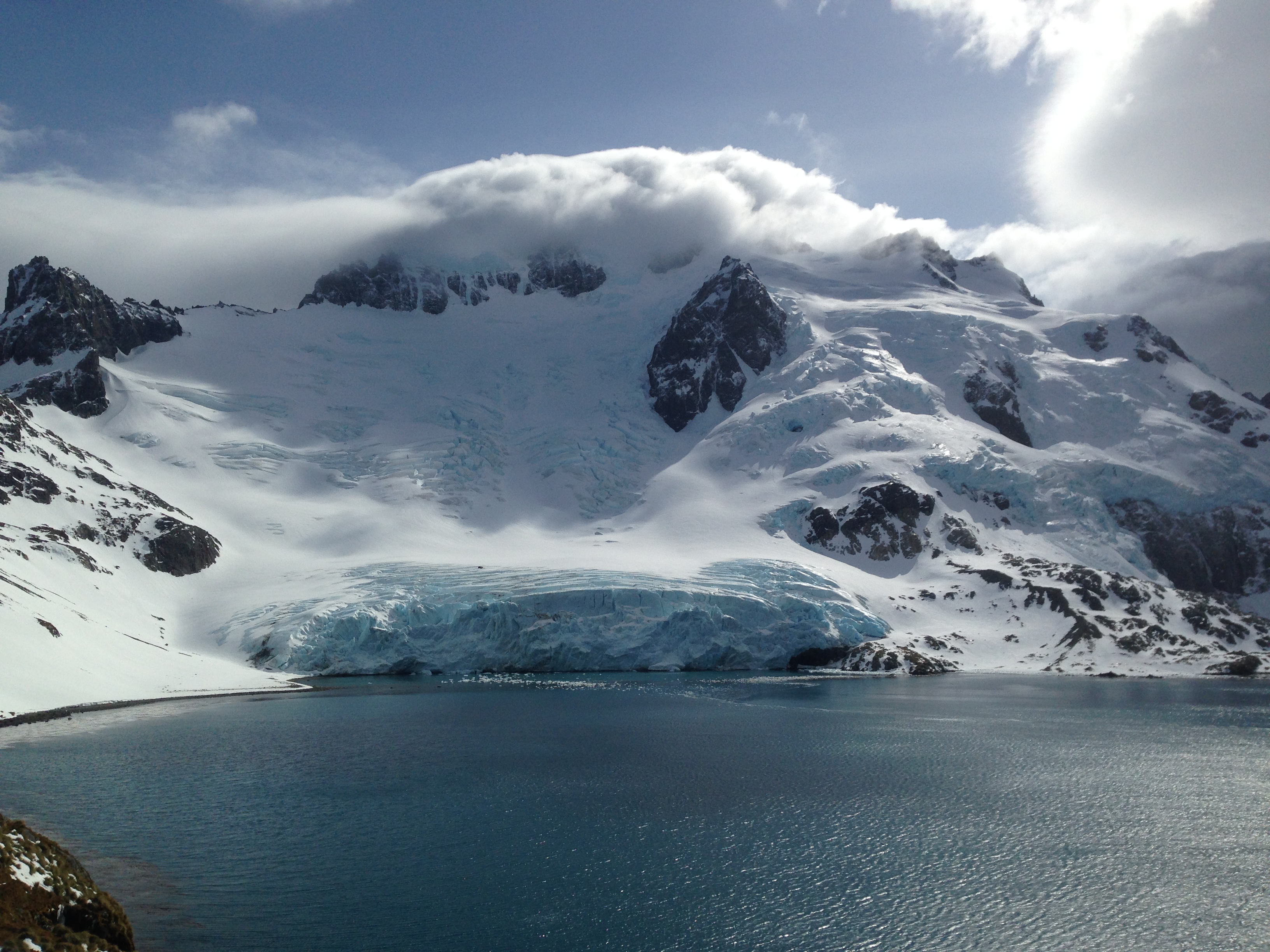 Blue ice from a glacier meets the water of Smaaland Cove, South Georgia.