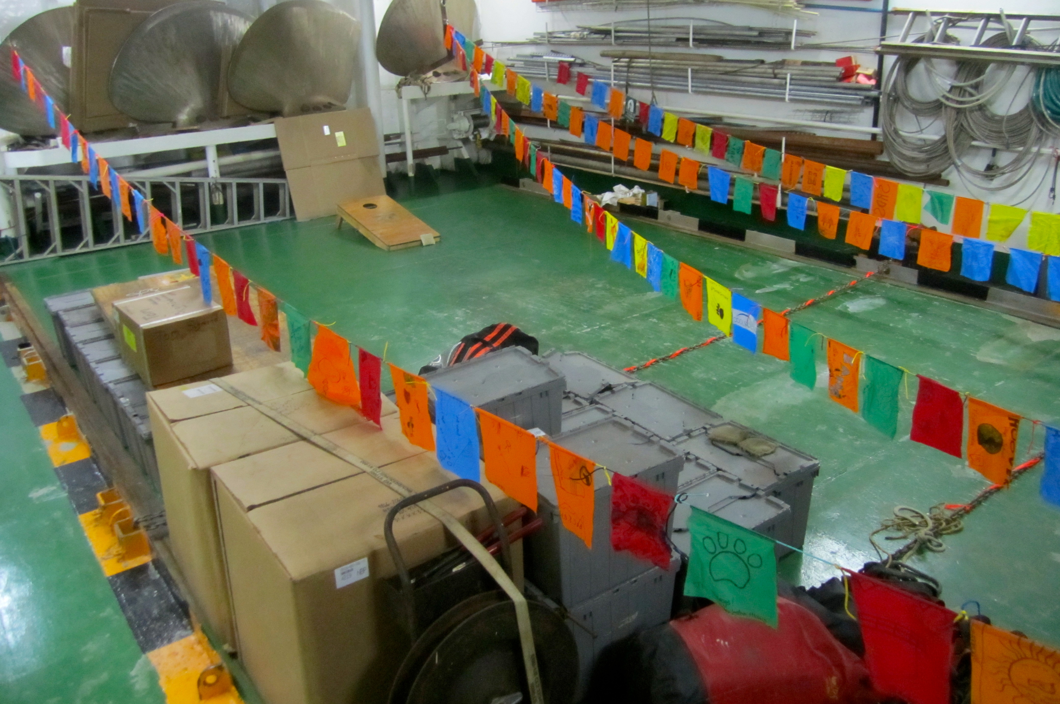 Many expedition flags from across America and the world, hang in the below decks. Aboard the R/V Nathaniel B. Palmer icebreaker, transiting back to Chile.