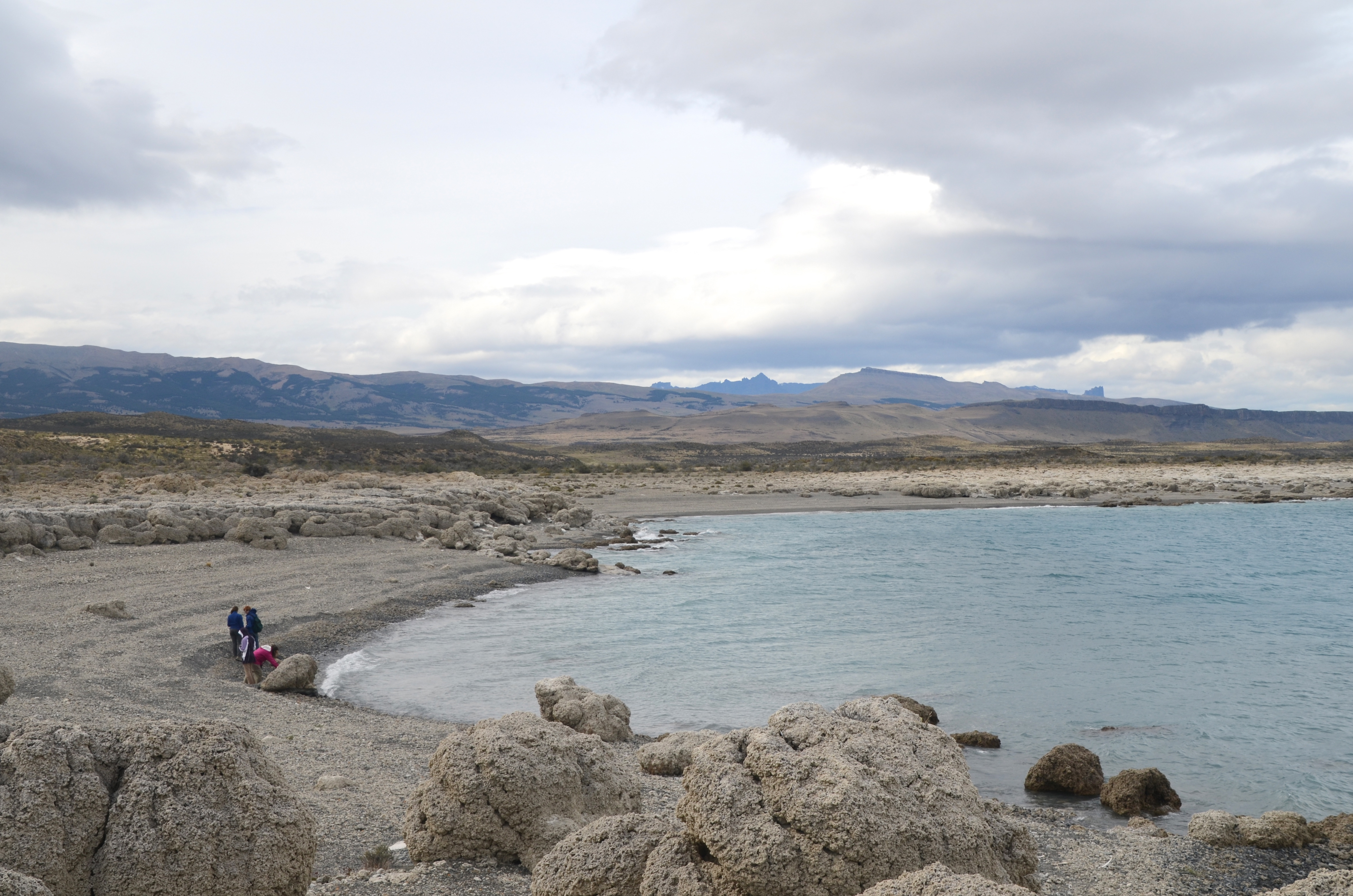 The JASE team at a beach in Lago Sarmiento. The shore is covered with dead thrombolites, while live thrombolites live below the shallow waters of this unique lake. Torres del Paine National Park, Chile.