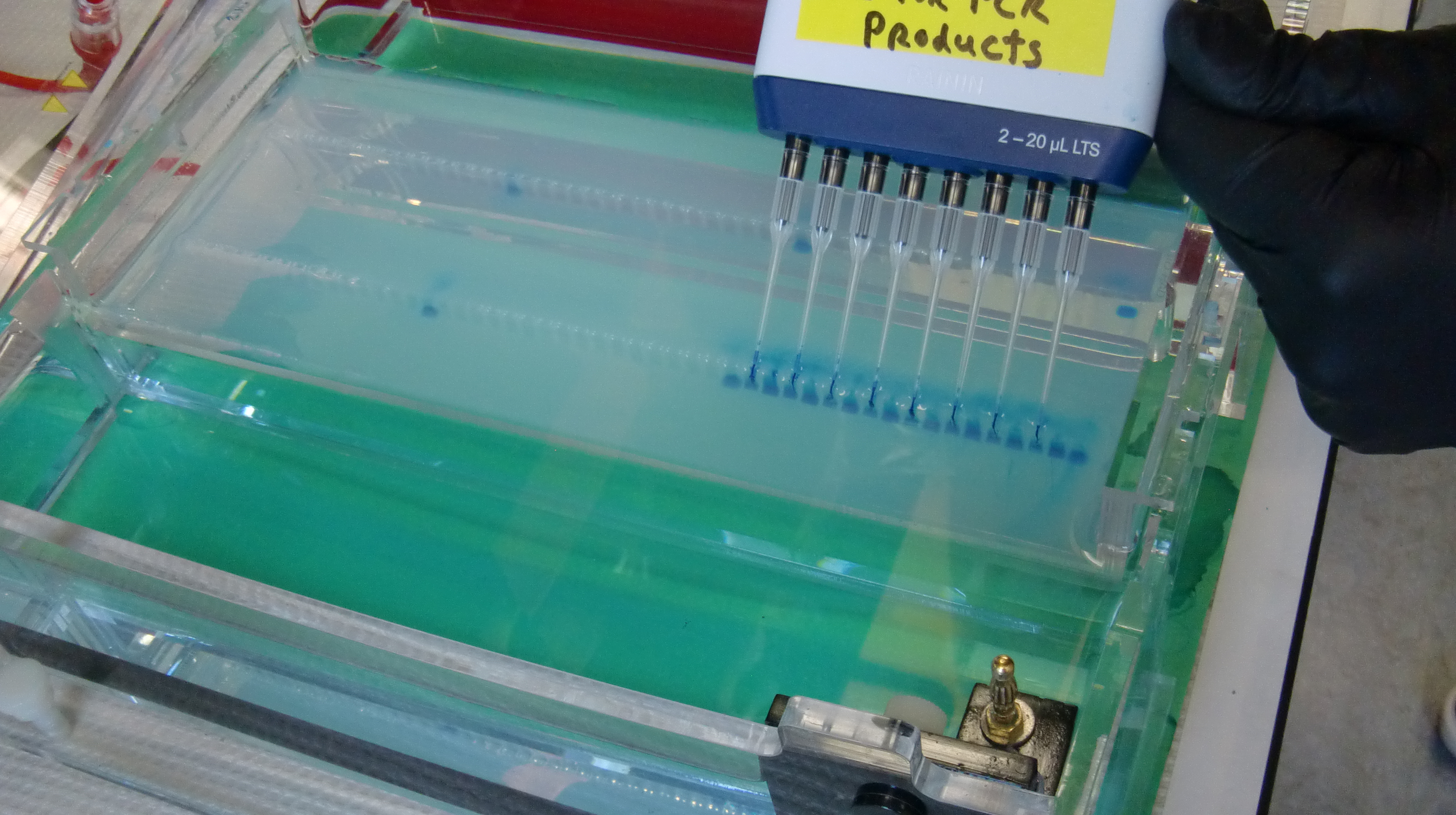 The blue dyed bacterial DNA is inserted into small wells in the gel. Each well represents a different sample collected from past fieldwork. A gel this size can run 96 samples simultaneously. Oregon State University, Corvallis, Oregon.