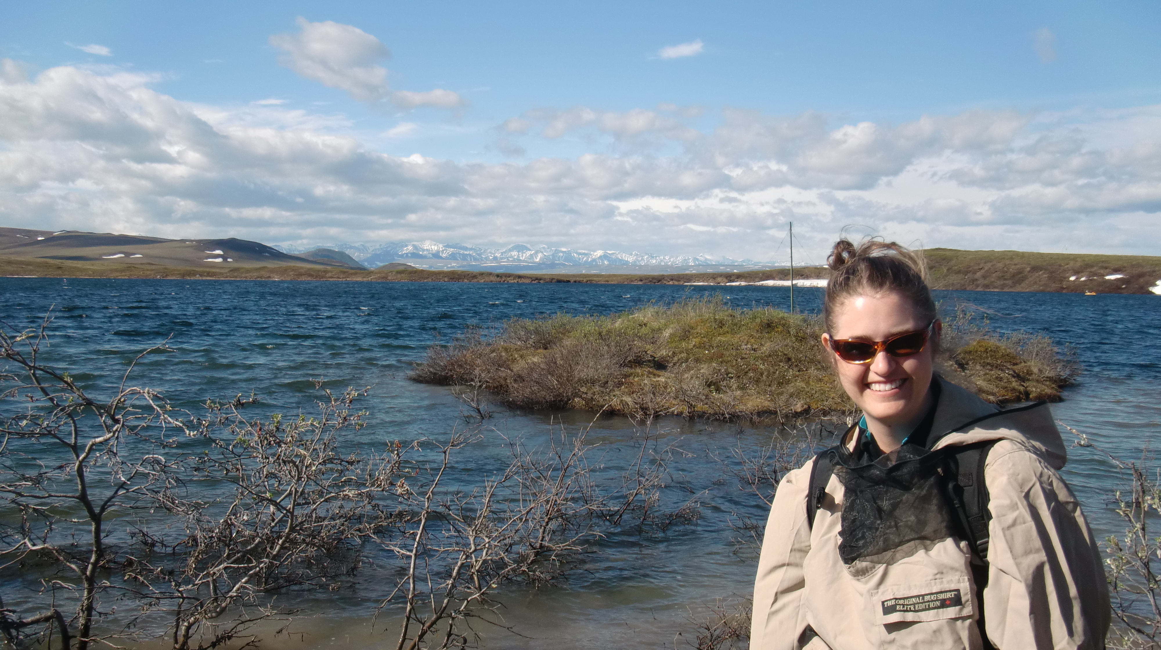 Lauren Watel checks out the thermokarst at NE-14. Lauren Watel: "It was a beautiful day, clear all the way to the Brooks Range, with a steady breeze to keep the mosquitos away!" Toolik Field Station, Alaska.