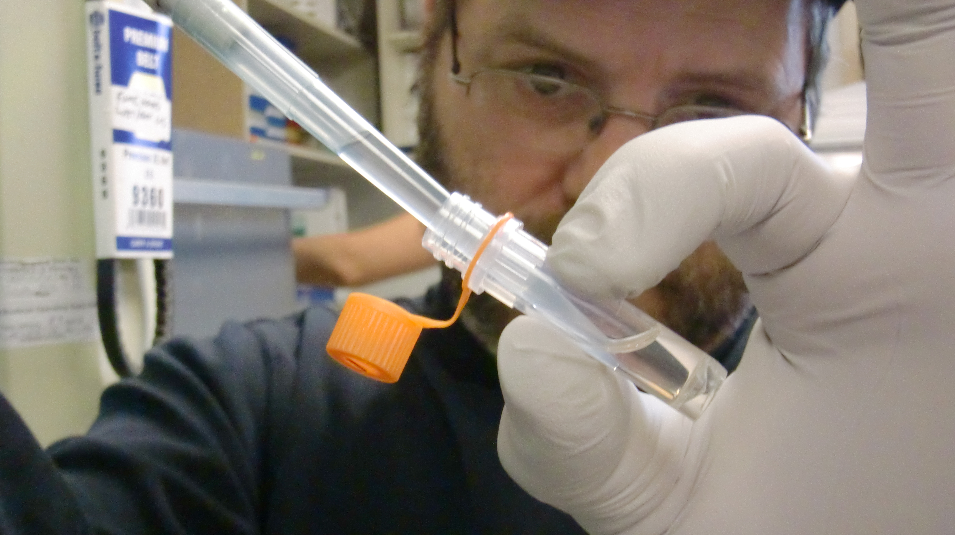 After ethanol is added to the tube, the DNA condenses and forms a small clump that is spun with the centrifuge to the bottom of the tube. The team carefully removes all remaining liquid with the pipette, so that just the small clump of DNA, which is located at the bottom of the tube, is left behind for storage and transfer to Oregon State University. Toolik Field Station, Alaska.