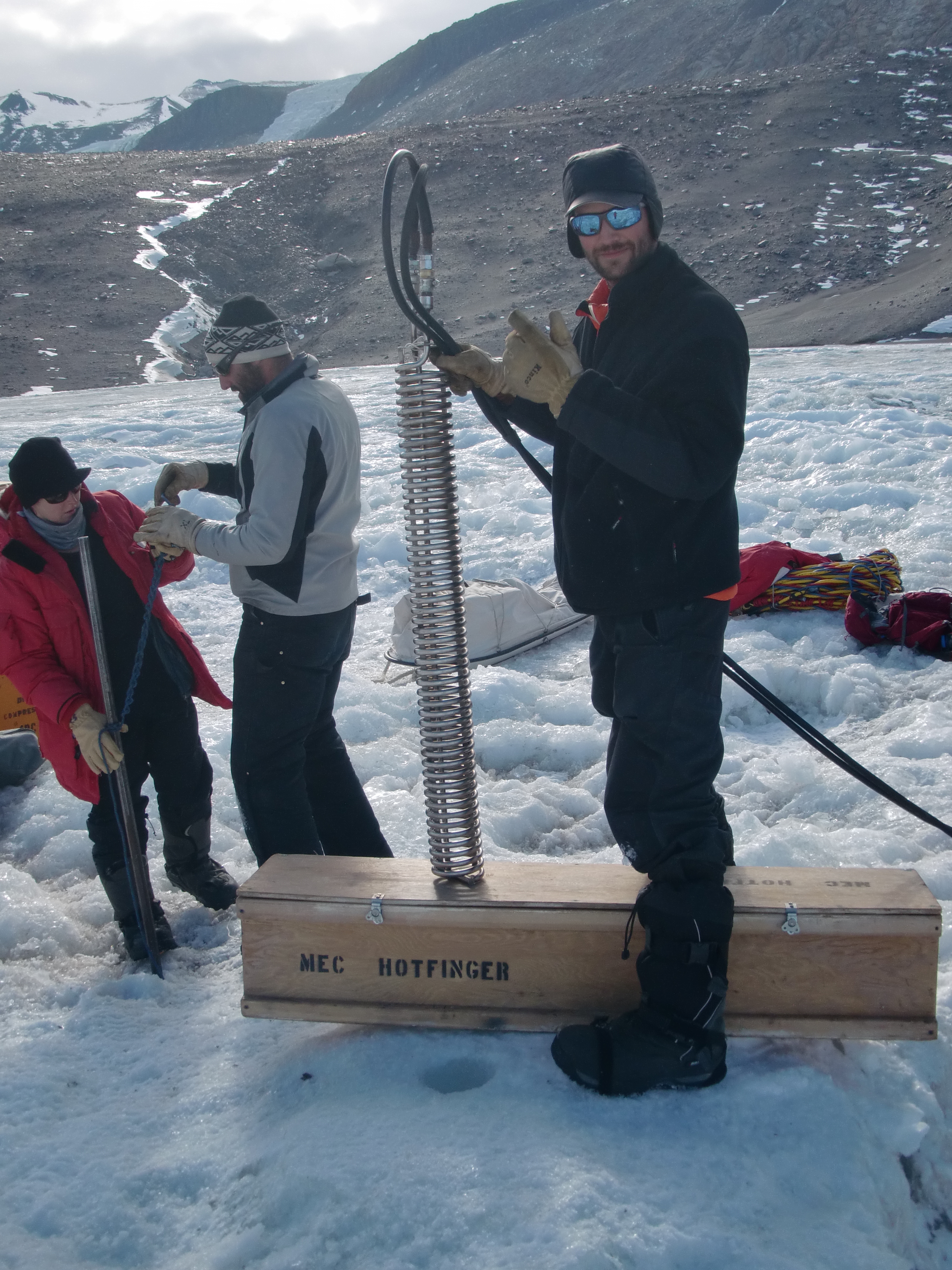 Geologist Tyler Mackey holds a hotfinger, which will melt a dive hole by conducting heated glycol through the metal coils. Lake Joyce, Antarctica.