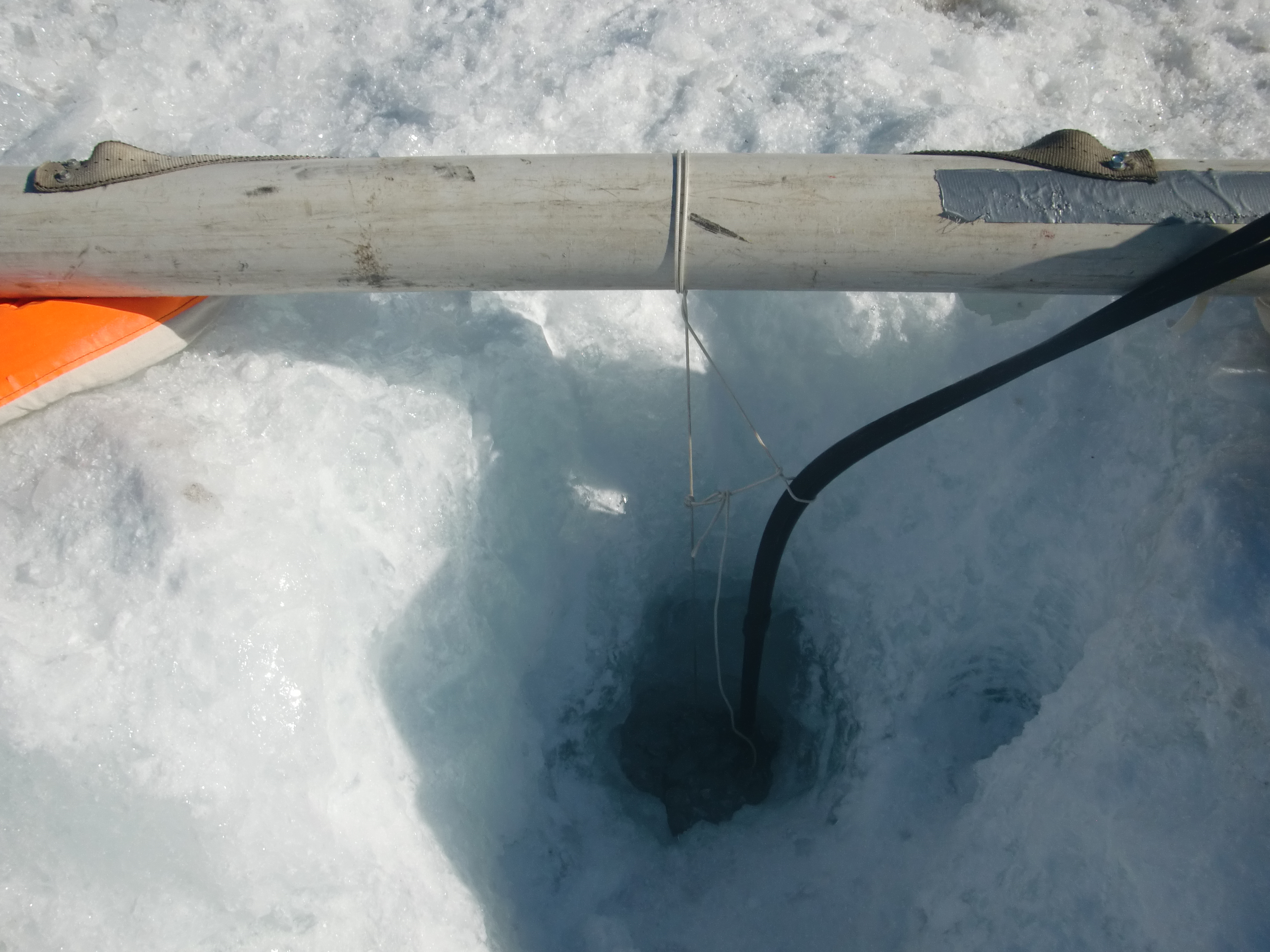 A dive hole in the process of being melted in the ice cover of Lake Joyce with a hotfinger. Lake Joyce, Antarctica.
