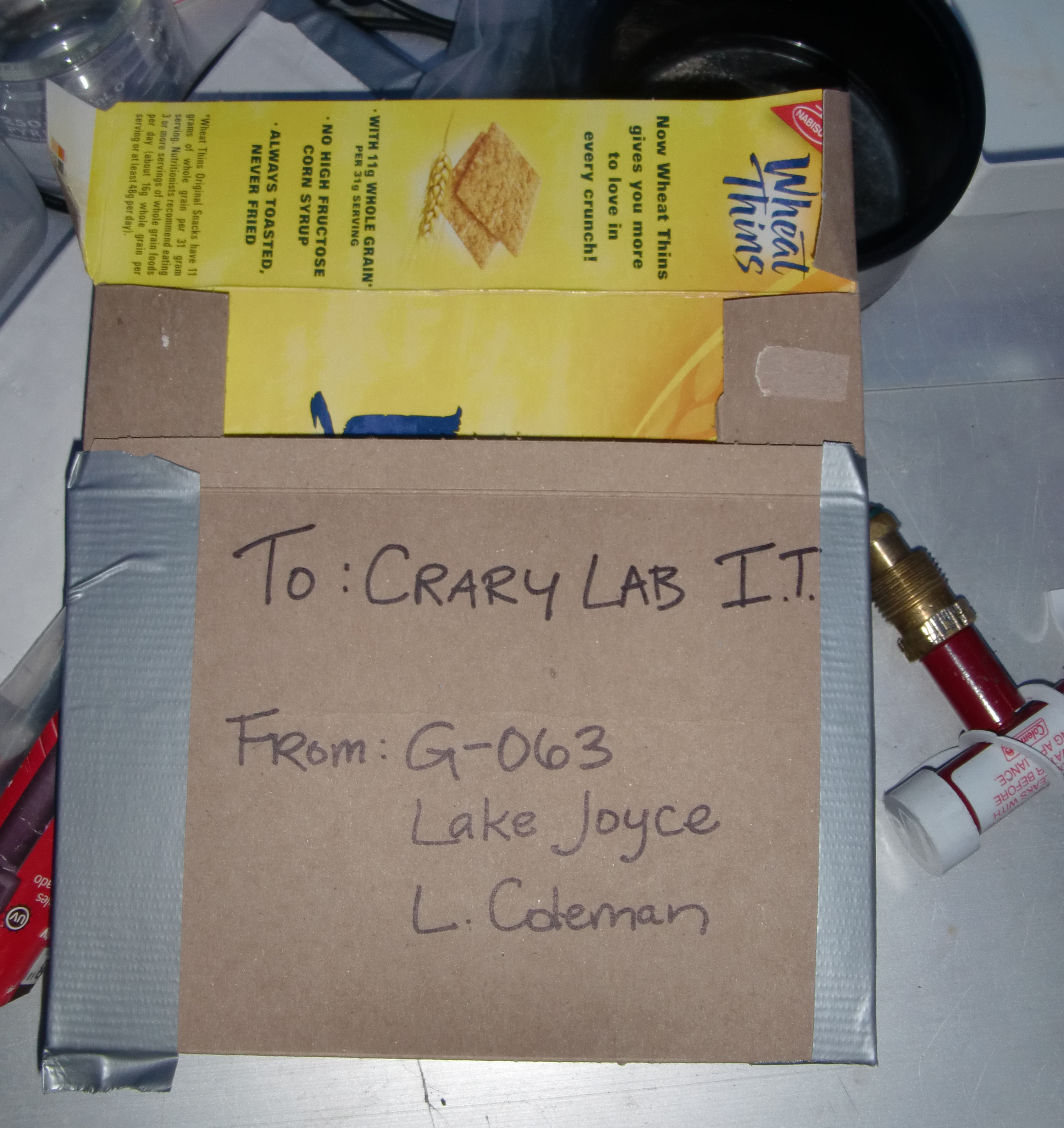 Lucy Coleman: "A package ready for helicopter transport – improvisation is a necessary skill in the Dry Valleys." Lake Joyce, Antarctica.
