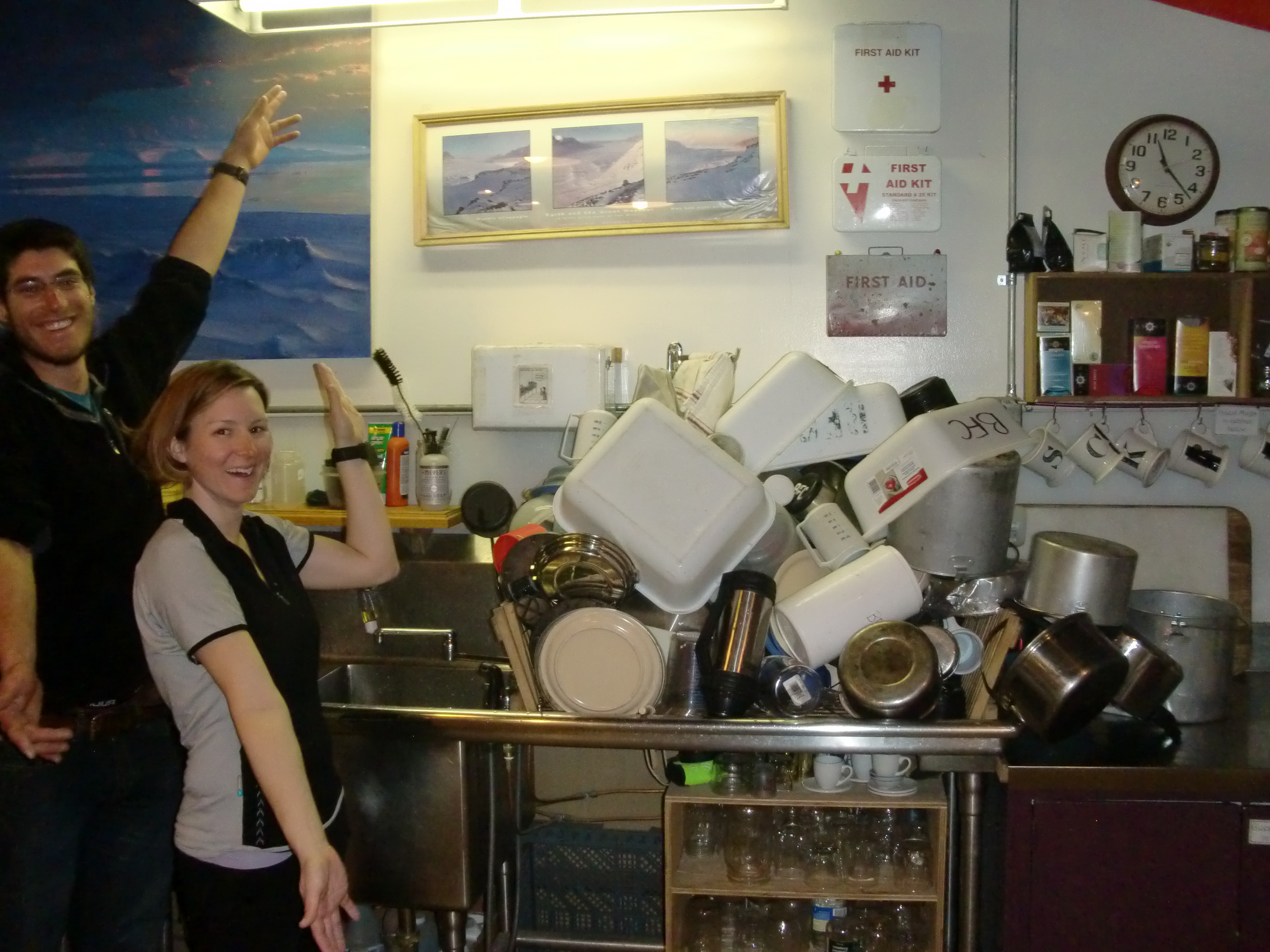 Scientists clean six weeks of dirty dishes at the Berg Field Center. McMurdo Station, Antarctica.