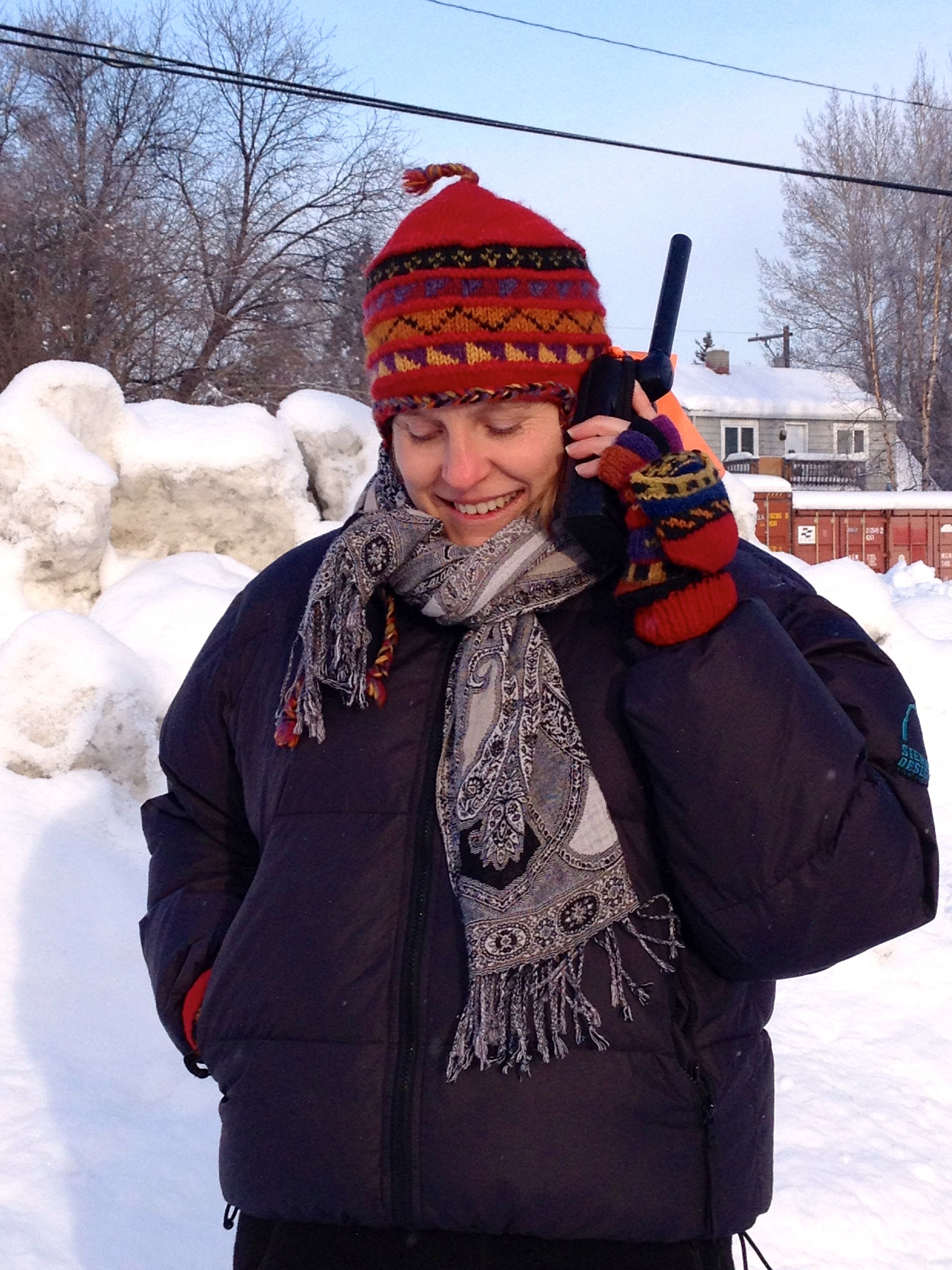 Lucy Coleman practices using a satellite phone during PolarTREC orientation. Fairbanks, Alaska.