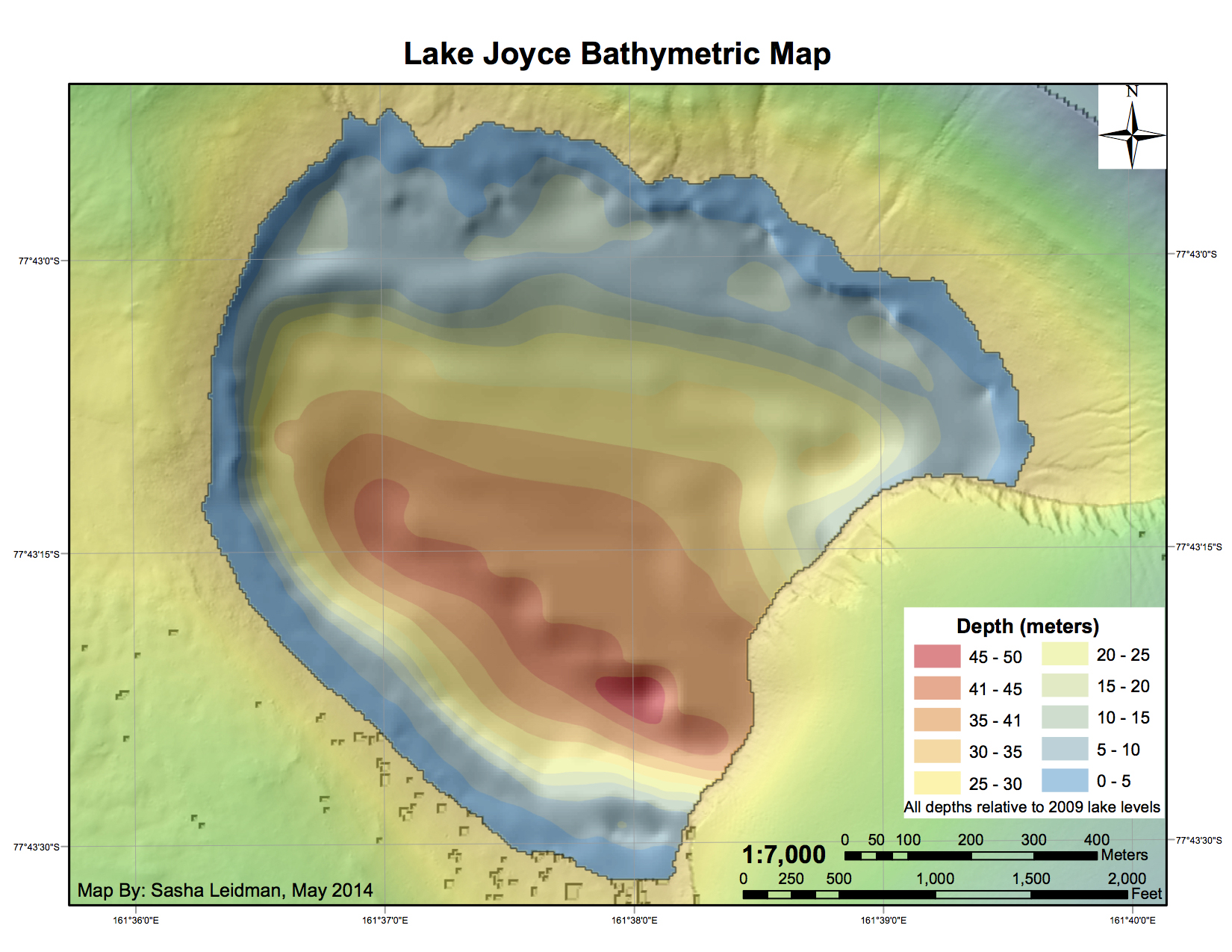 Lucy Coleman: "A first bathymetric map of Lake Joyce based on outdated records – a good starting point." Lake Joyce, Antarctica.