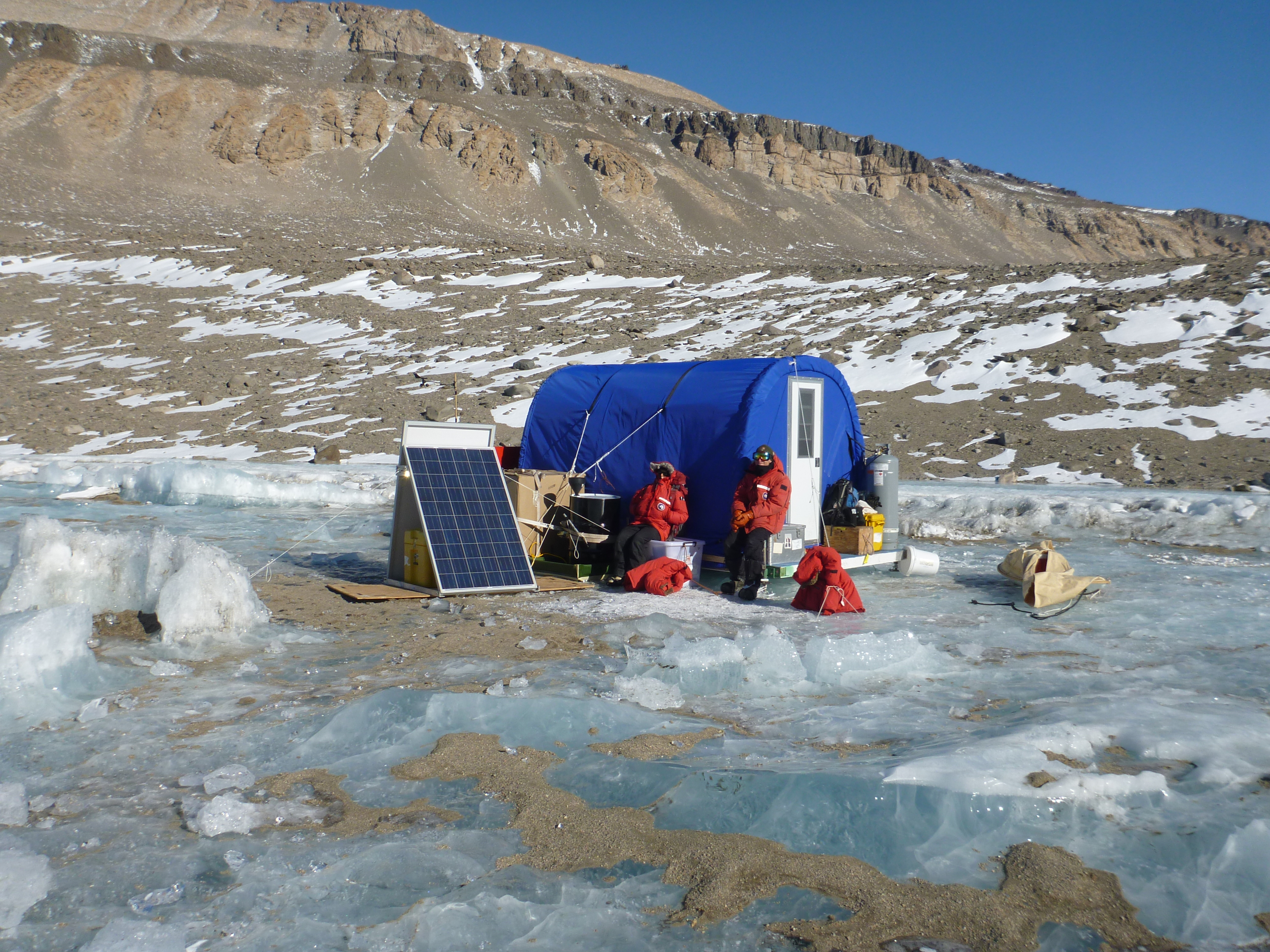 A polarhaven tent on Lake Joyce with a solar array for power. Lake Joyce, Antarctica.