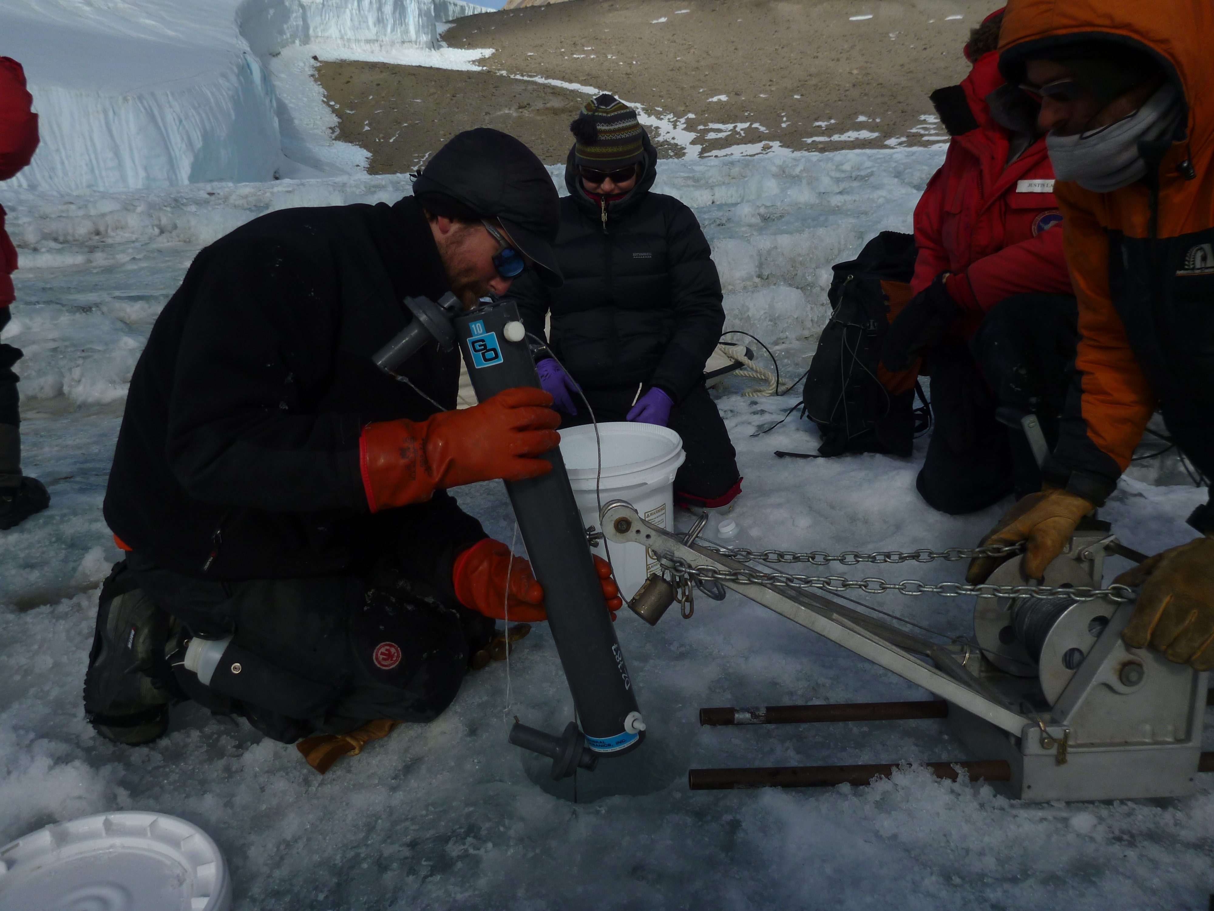 Researchers collect water from a niskin water sampler. Lake Joyce, Antarctica.