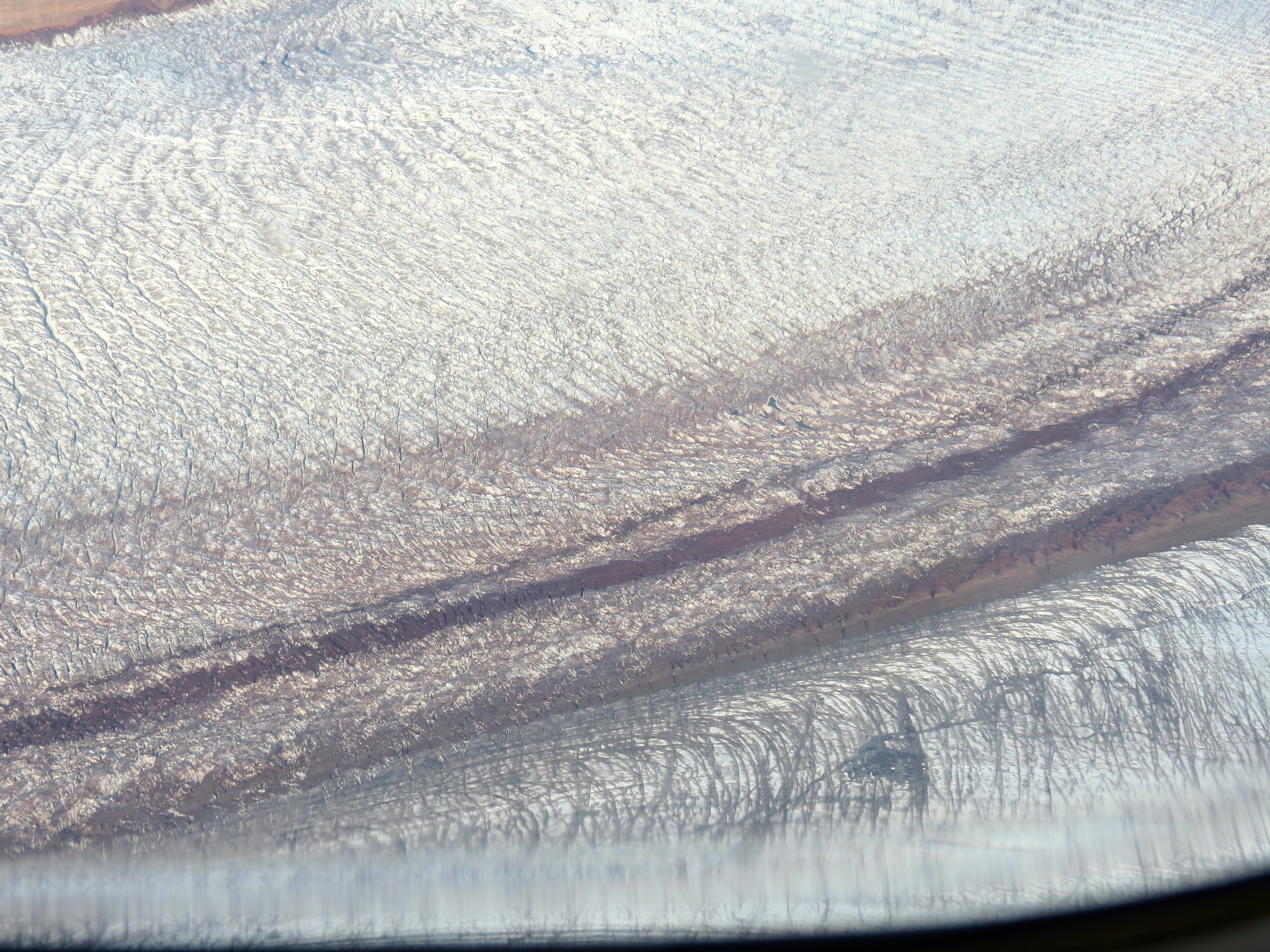 Medial morraines of the Kronebreen and Kongsvegen glaciers. The sediment gets caught between the two merging tidewater glaciers. Ny Alesund, Svalbard, Norway.