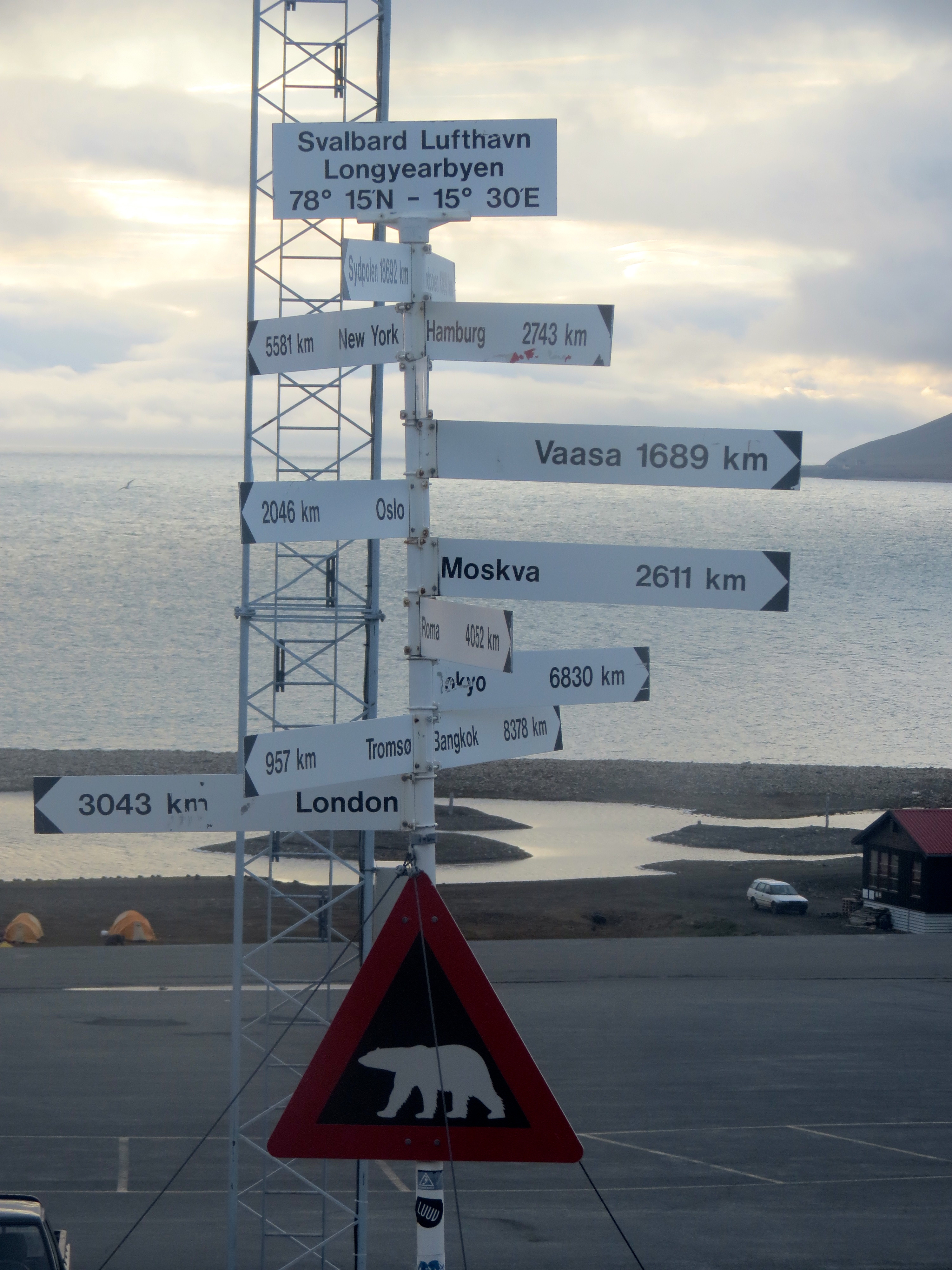 A distance sign post with a sign warning about polar bears outside of the airport. Longyearbyen, Svalbard, Norway.
