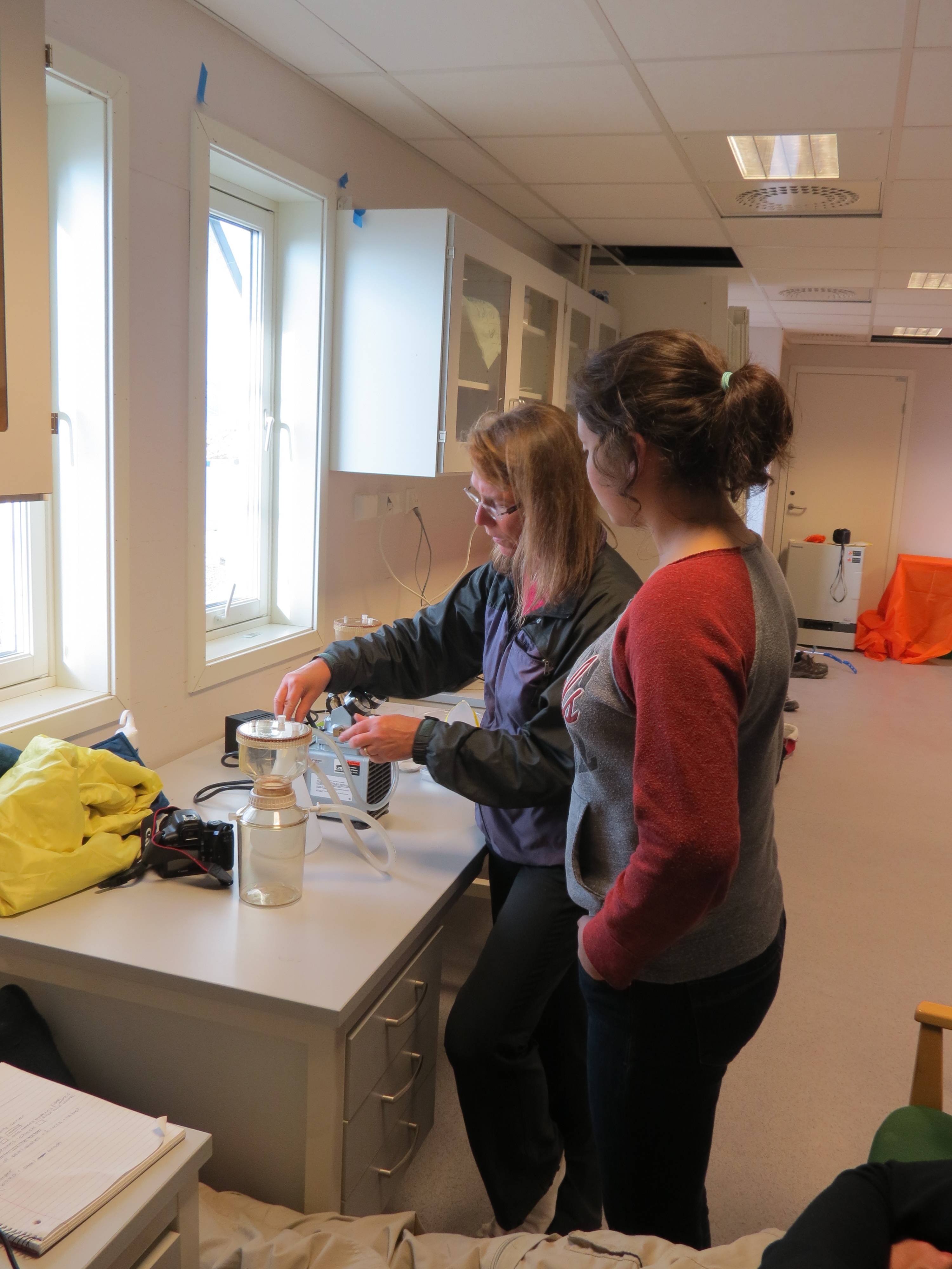 Jessica Miles gets a lesson on how to filter sediment samples from Dr. Julie Brigham-Grette. Ny Alesund, Svalbard, Norway.