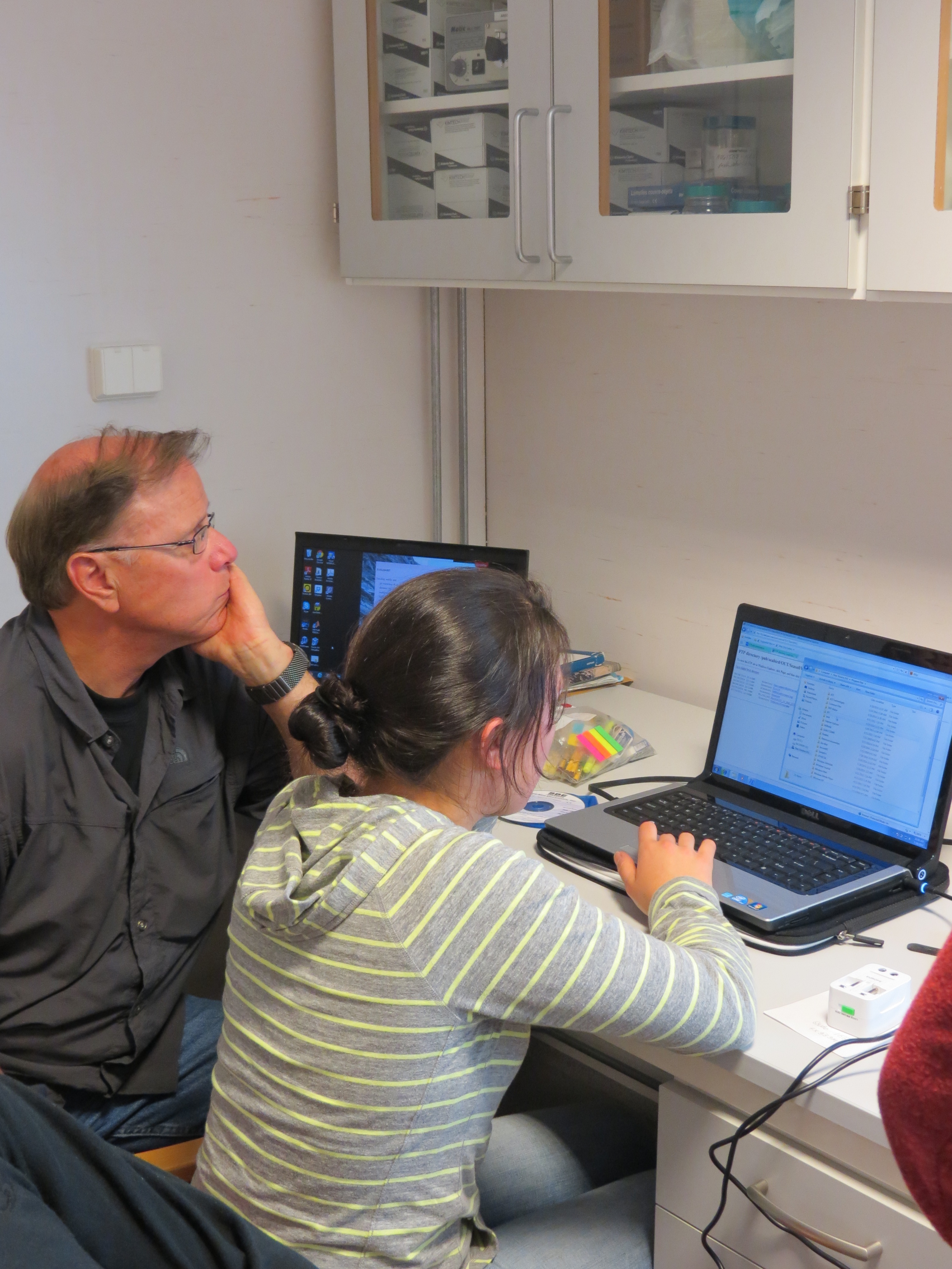 Ross Powell and Dominique Seles set up the software to read data. Ny Alesund, Svalbard, Norway.