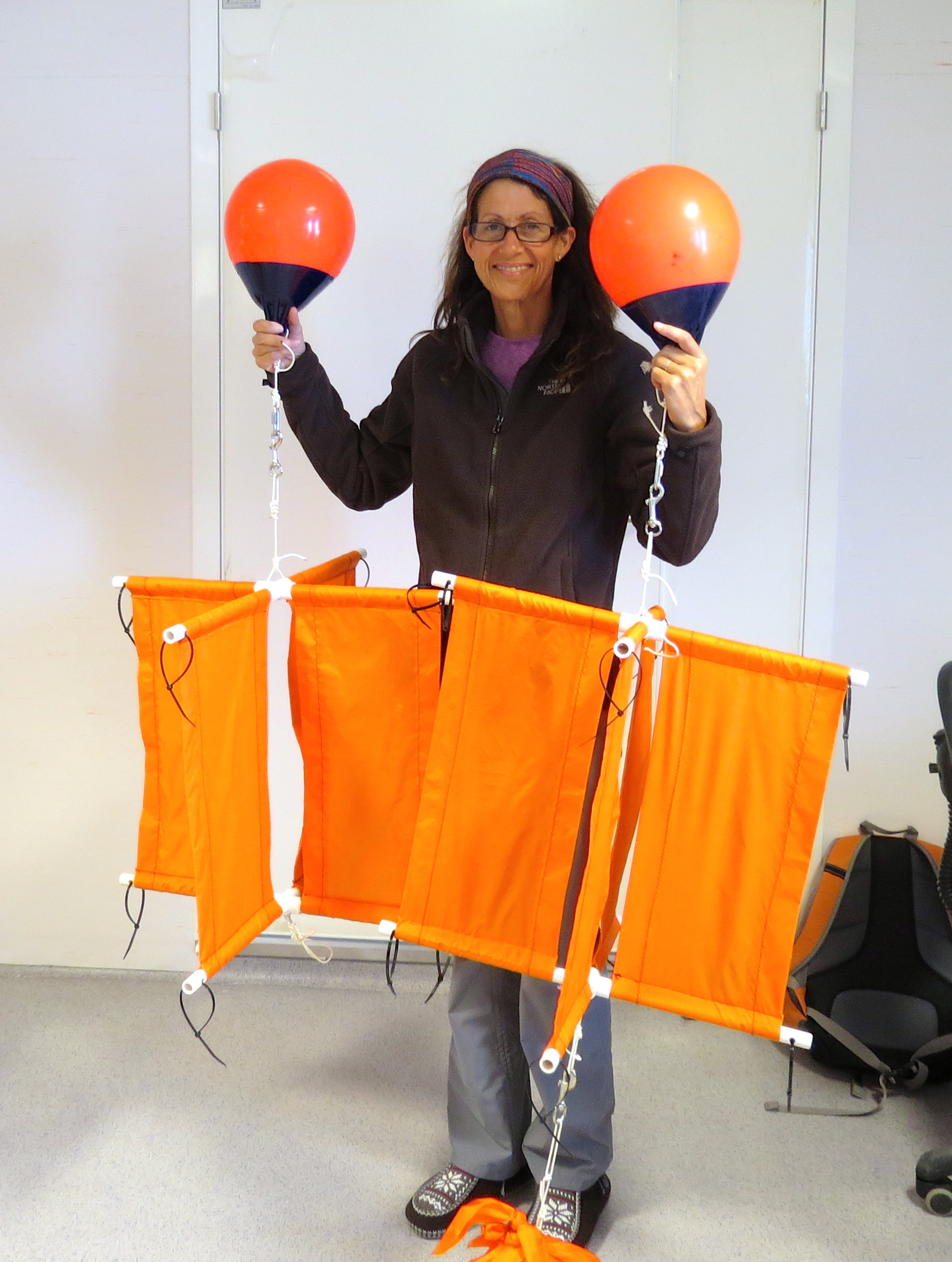 Peggy McNeal sewed together a drougue to use to test the speed of current in the fjord. Ny Alesund, Svalbard, Norway.