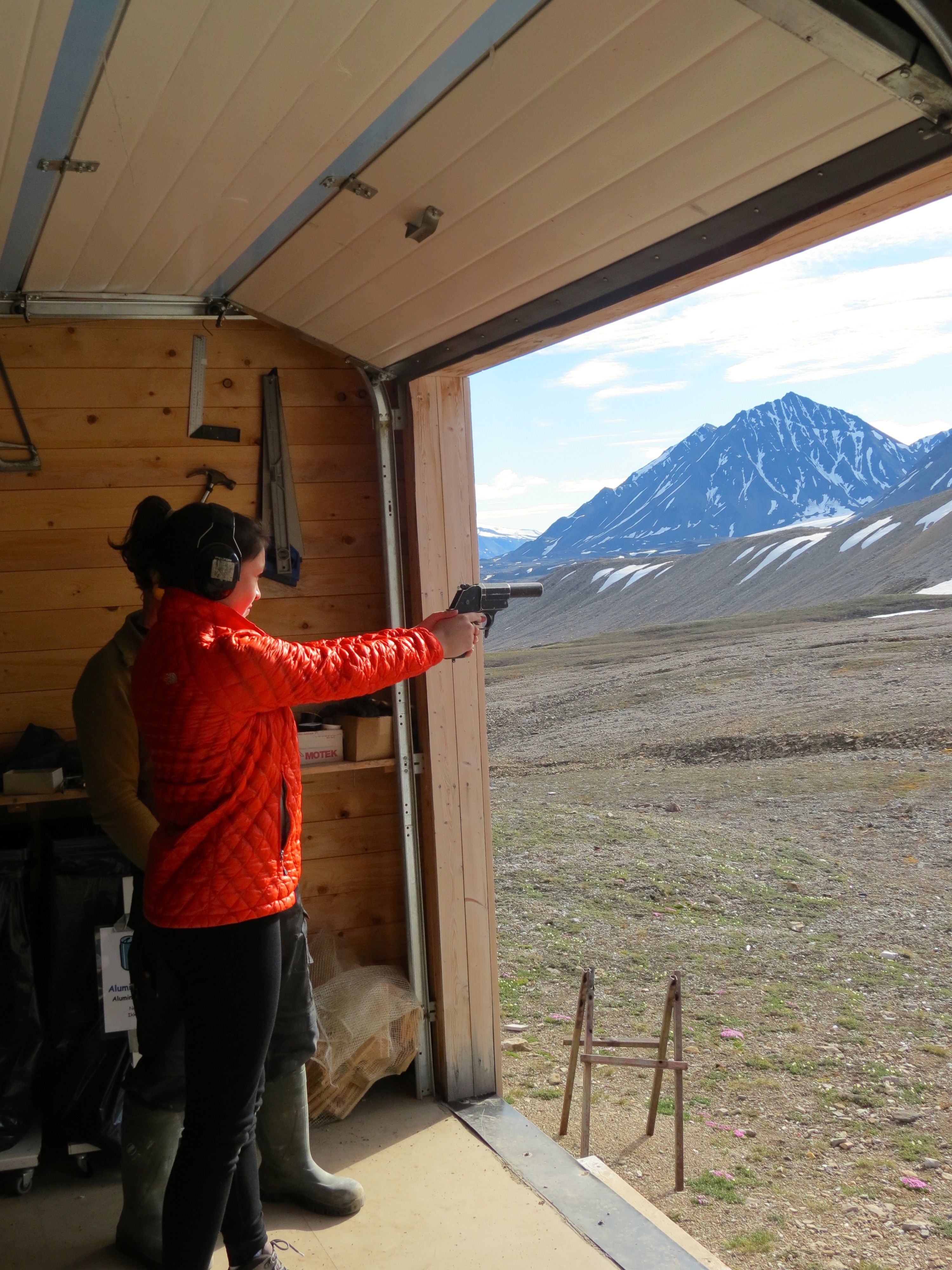 Jessica Miles practices with a flair gun in case the team needs to scare away a polar bear. Ny Alesund, Svalbard, Norway.