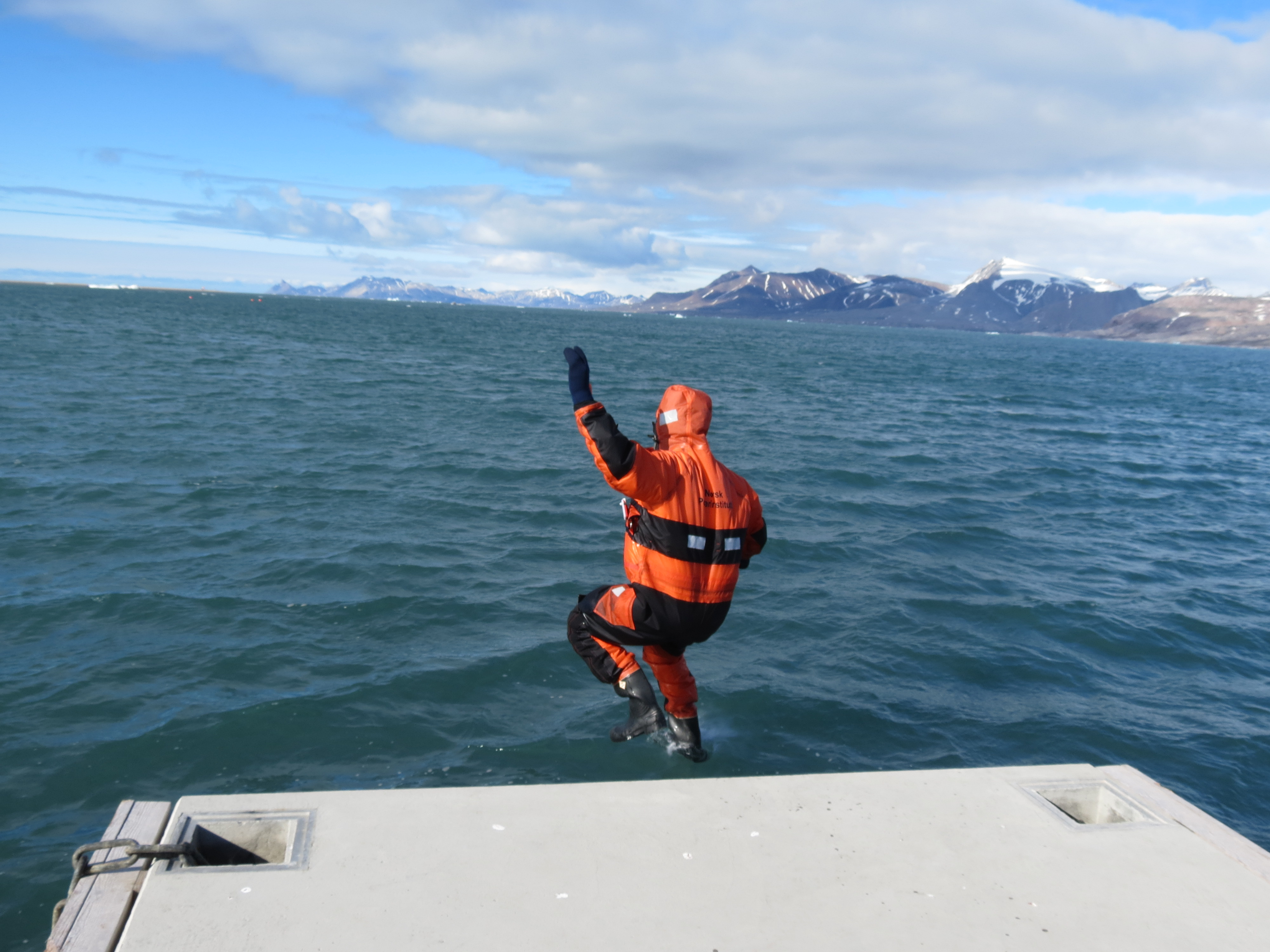 A team member tests out their dry suit. Ny Alesund, Svalbard, Norway.