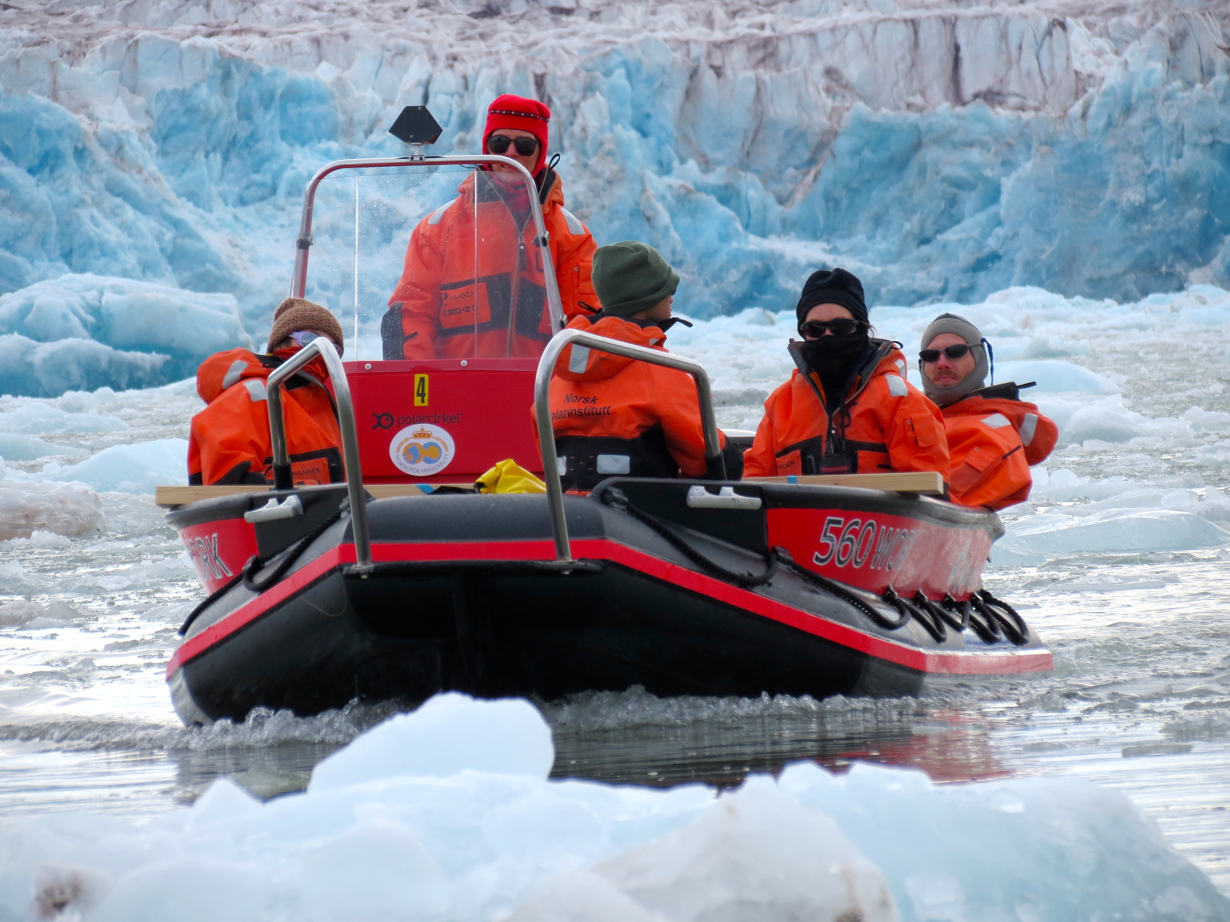 Julie Brigham-Grette and students in the icy Kongsfjorden, Ny Alesund, Svalbard, Norway.