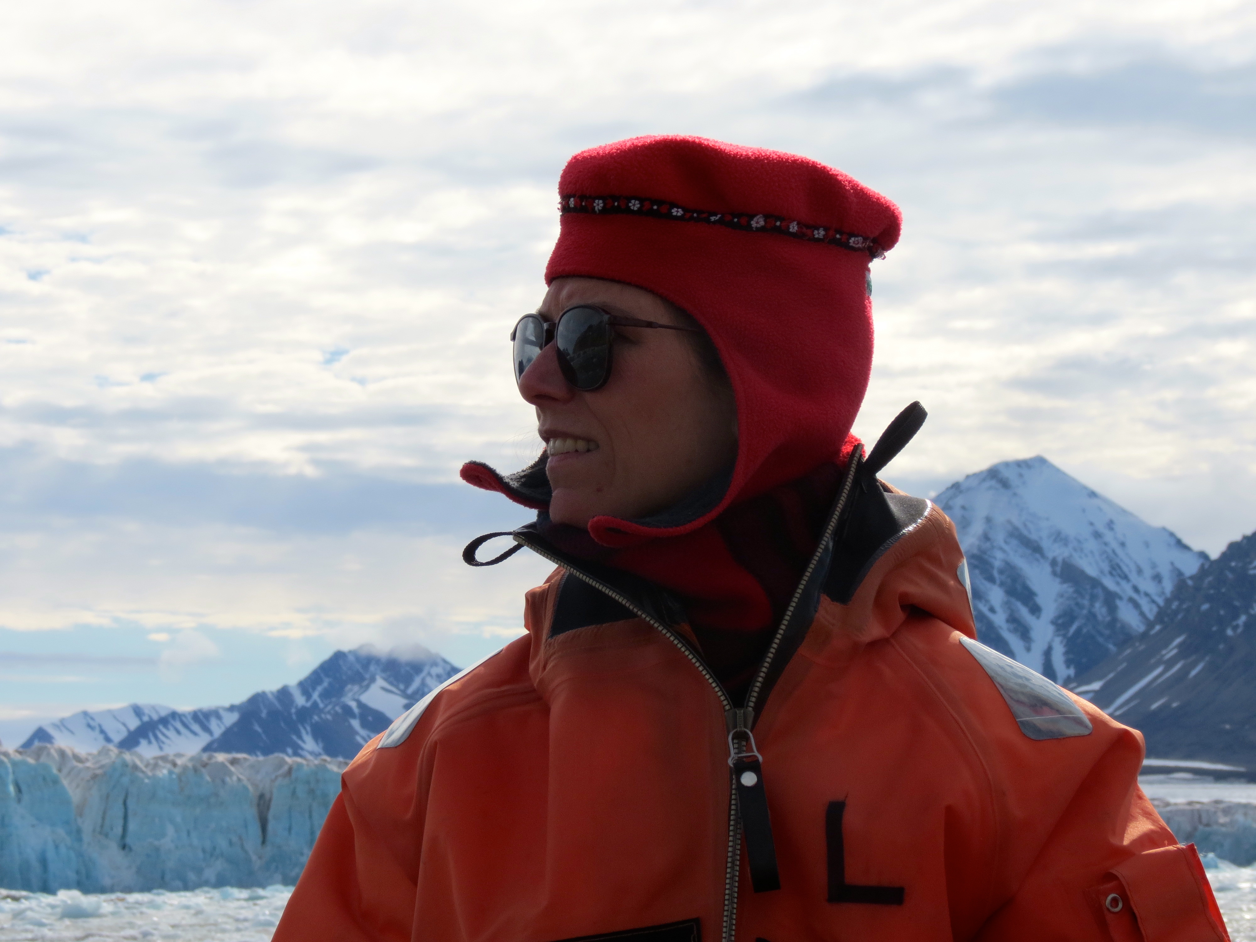 Researcher Julie Brigham-Grette out on Kongsfjorden. Her research interests are focused on the stratigraphy, sedimentology, and chronology of geologic systems that record the climate evolution and sea level history of the Arctic since the mid-Pliocene. Ny Alesund, Svalbard, Norway.