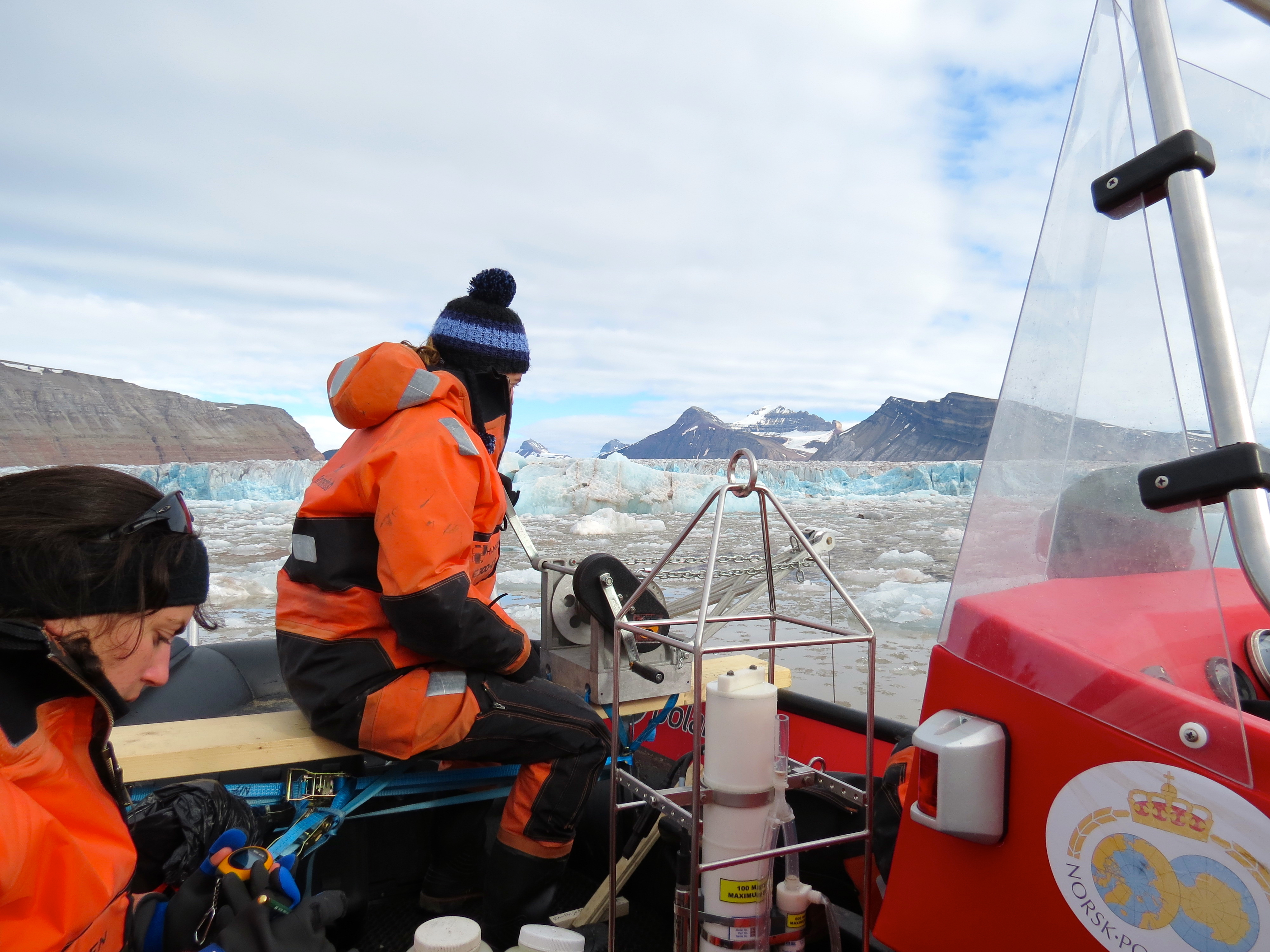 Courtney Payne prepares the CTD. A CTD measures conductivity, temperature, and pressure. Conductivity is a proxy measure for salinity. Kongsfjorden, Ny Alesund, Svalbard, Norway.