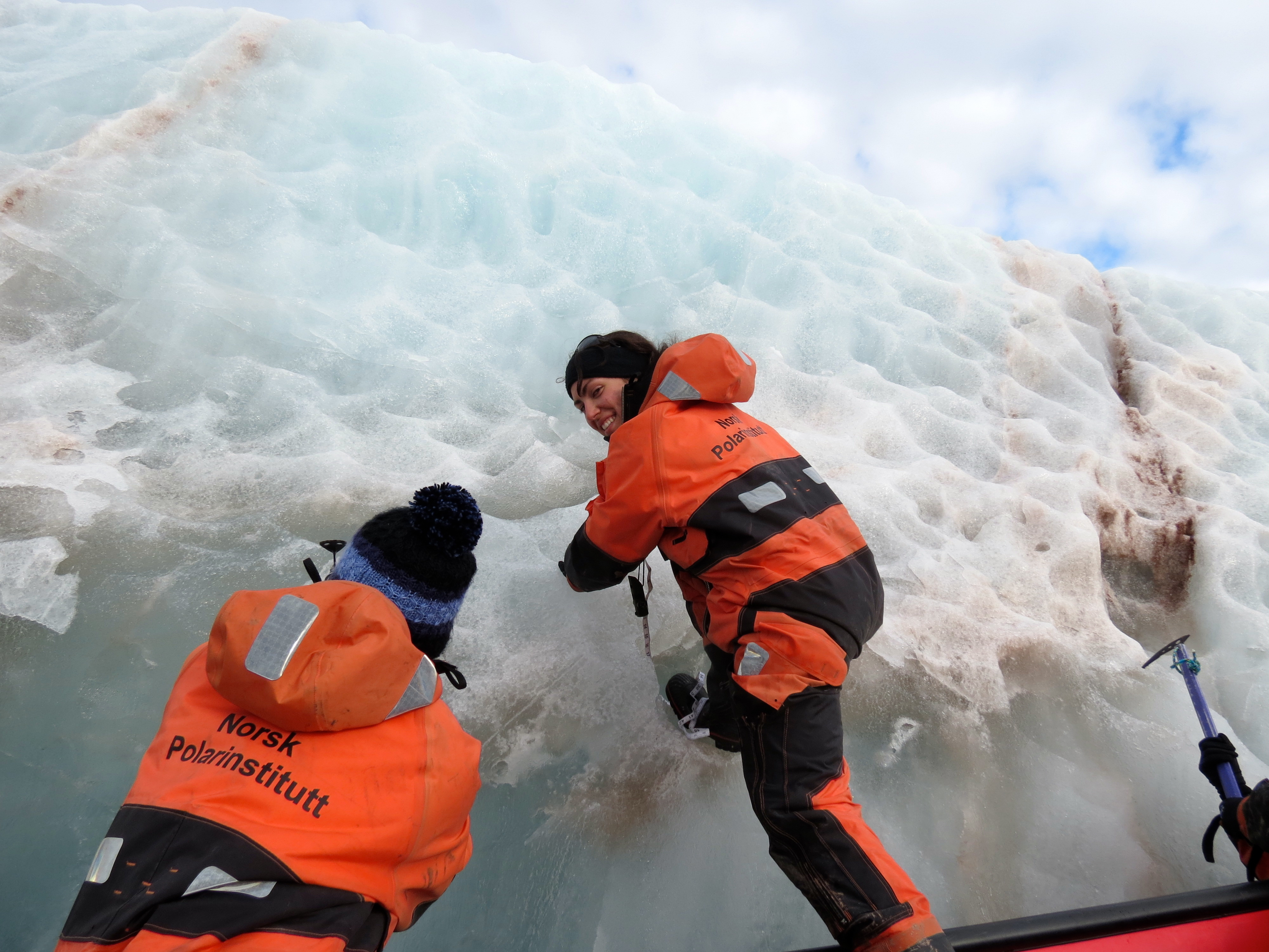 Dominique Seles measures ice cusps on an iceberg. The diameter of the cusps relates to the speed of the intra-glacial current. Kongsfjorden, Ny Alesund, Svalbard, Norway.