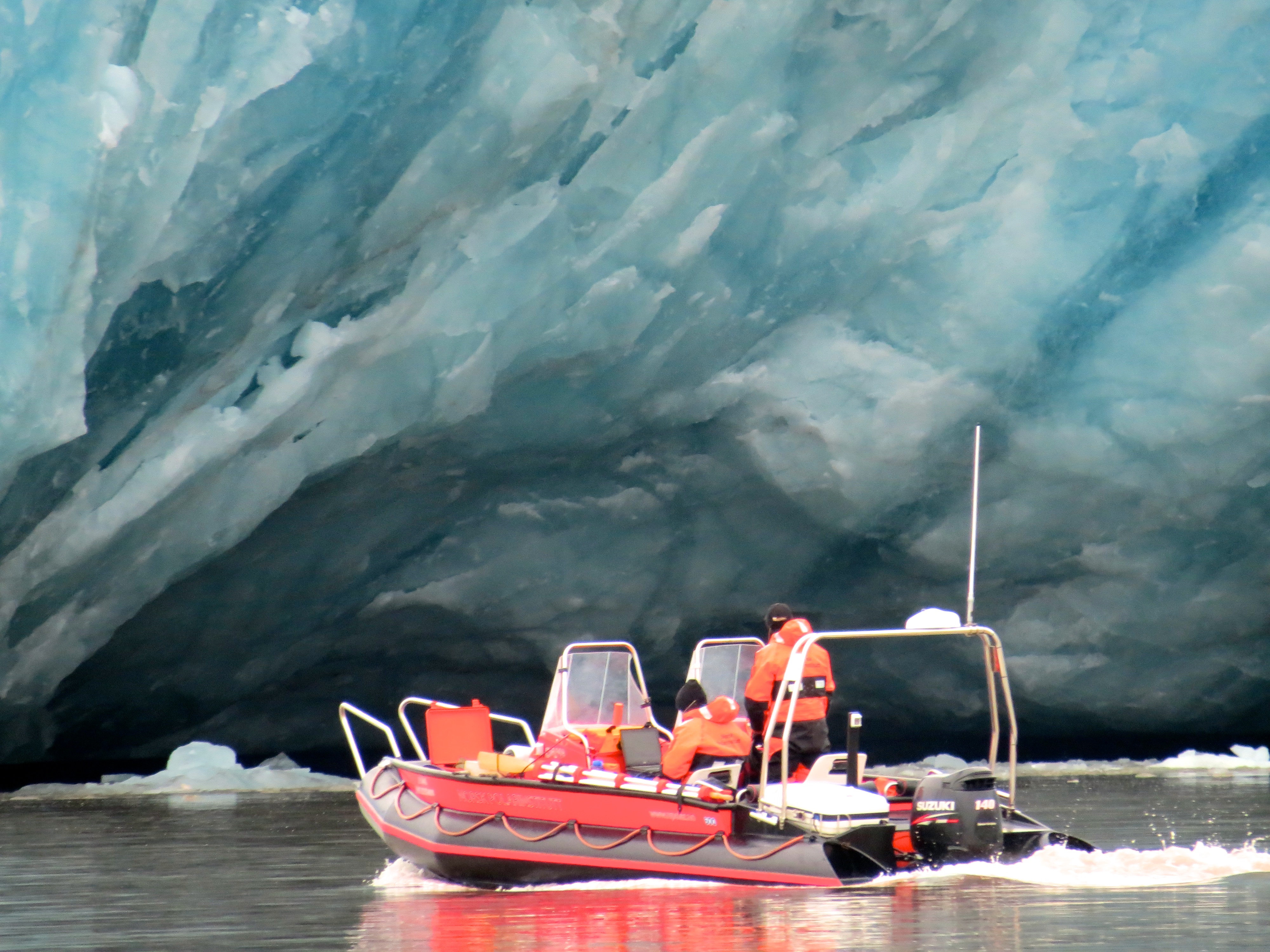 Ross Powell and Kean Ivey close in on this ice cave to get bathymetric measurements. Kongsfjorden, Ny Alesund, Svalbard, Norway.