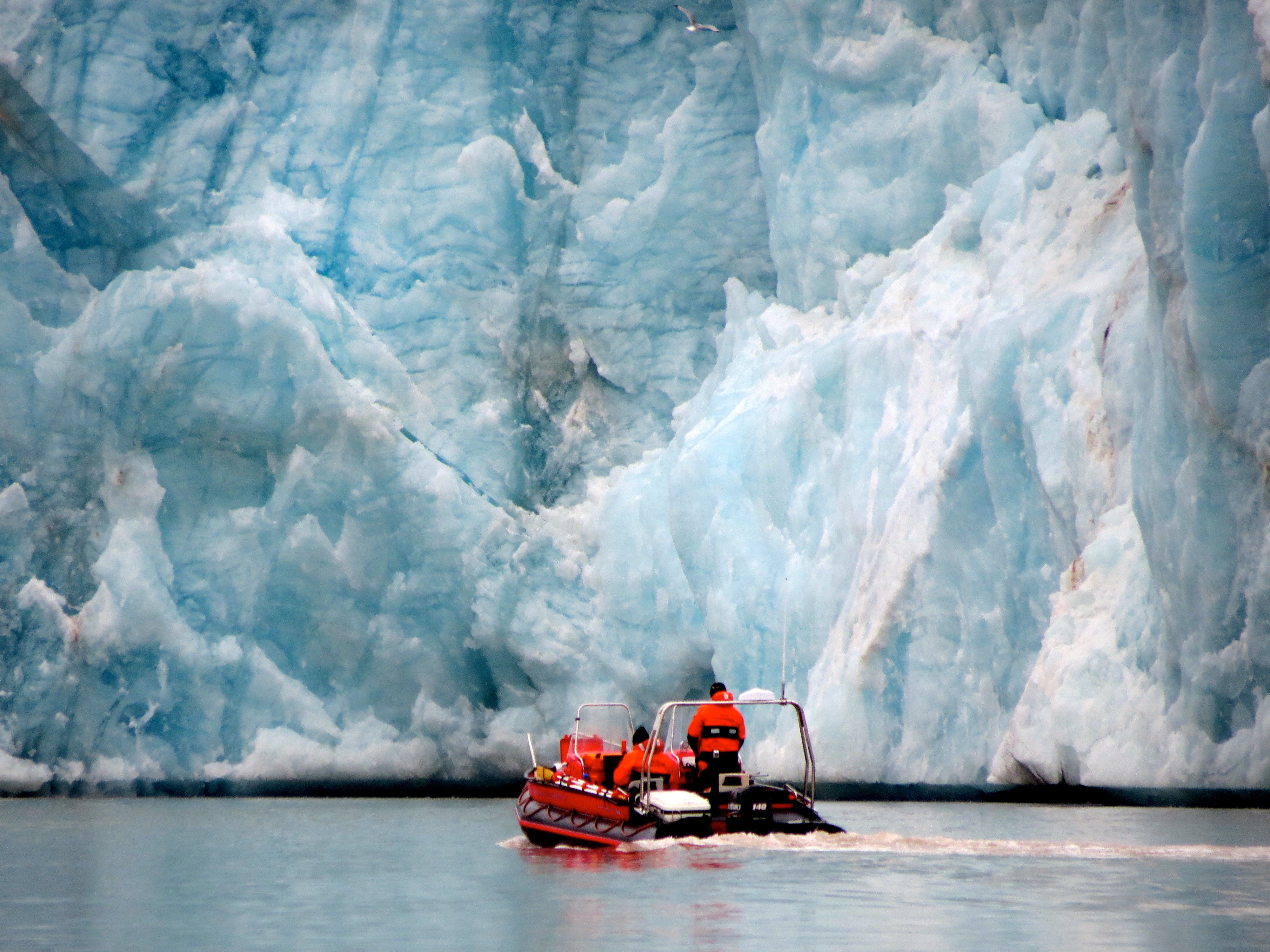 Ross Powell and Kean Ivey get in close for bathymetric measurements in front of Kronebreen glacier. Kongsfjorden, Ny Alesund, Svalbard, Norway.