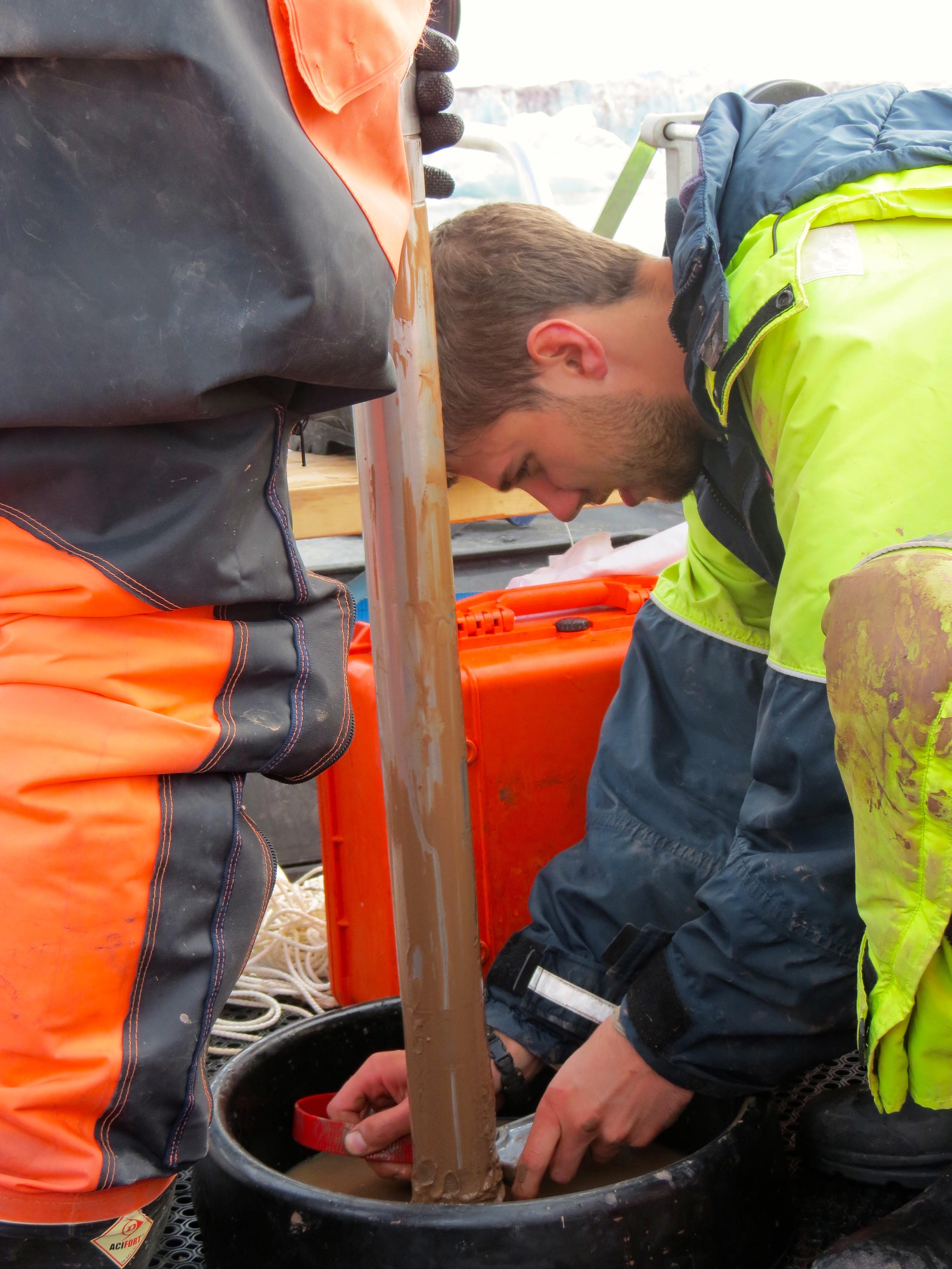Steve Ossim prepares a gravity core sample. Kongsfjorden, Ny Alesund, Svalbard, Norway.