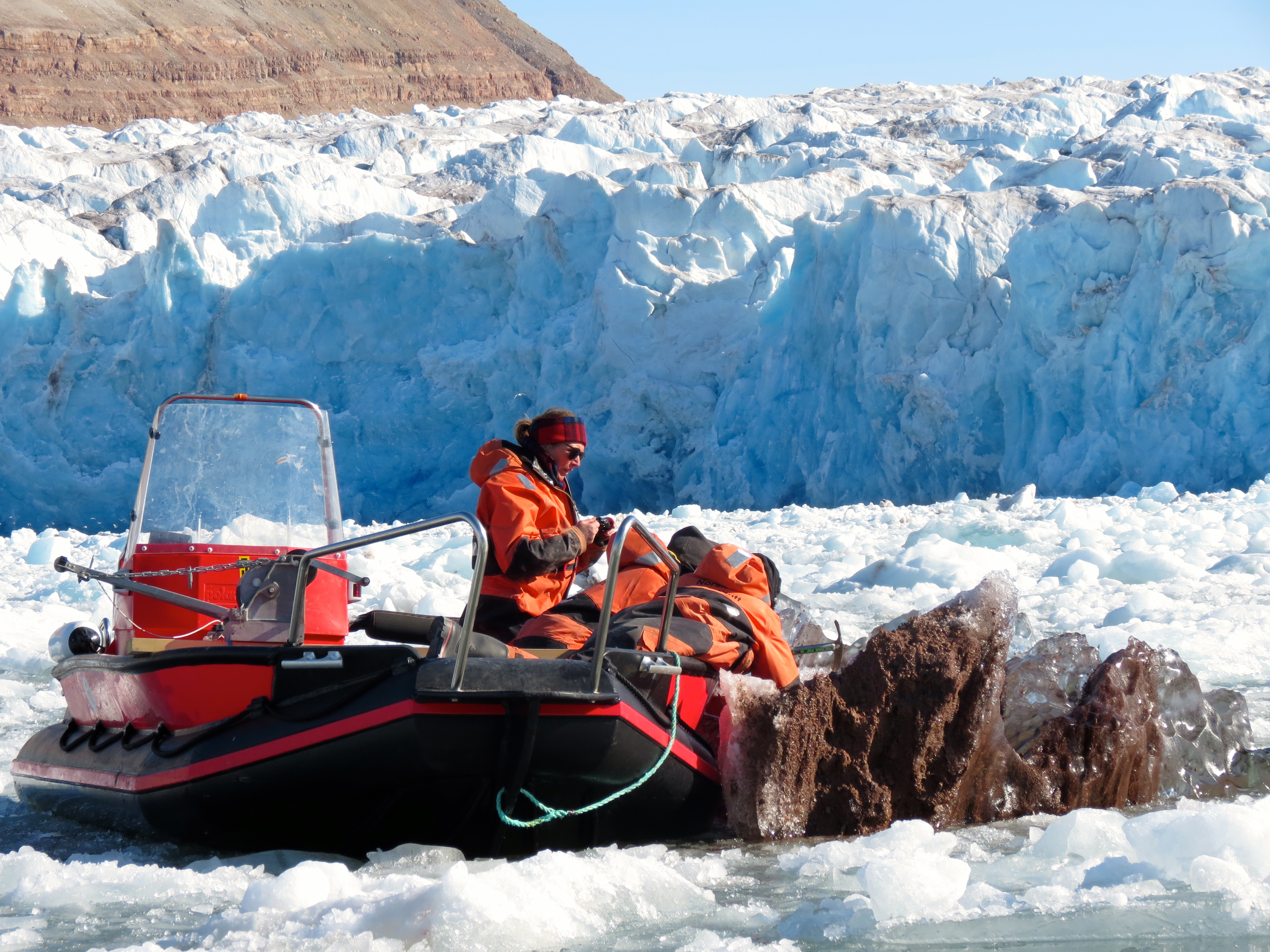Julie Brigham-Grette and REU students collect sediment from an iceberg. The icebergs are a prime source of sediment samples. Kongsfjorden, Ny Alesund, Svalbard, Norway.