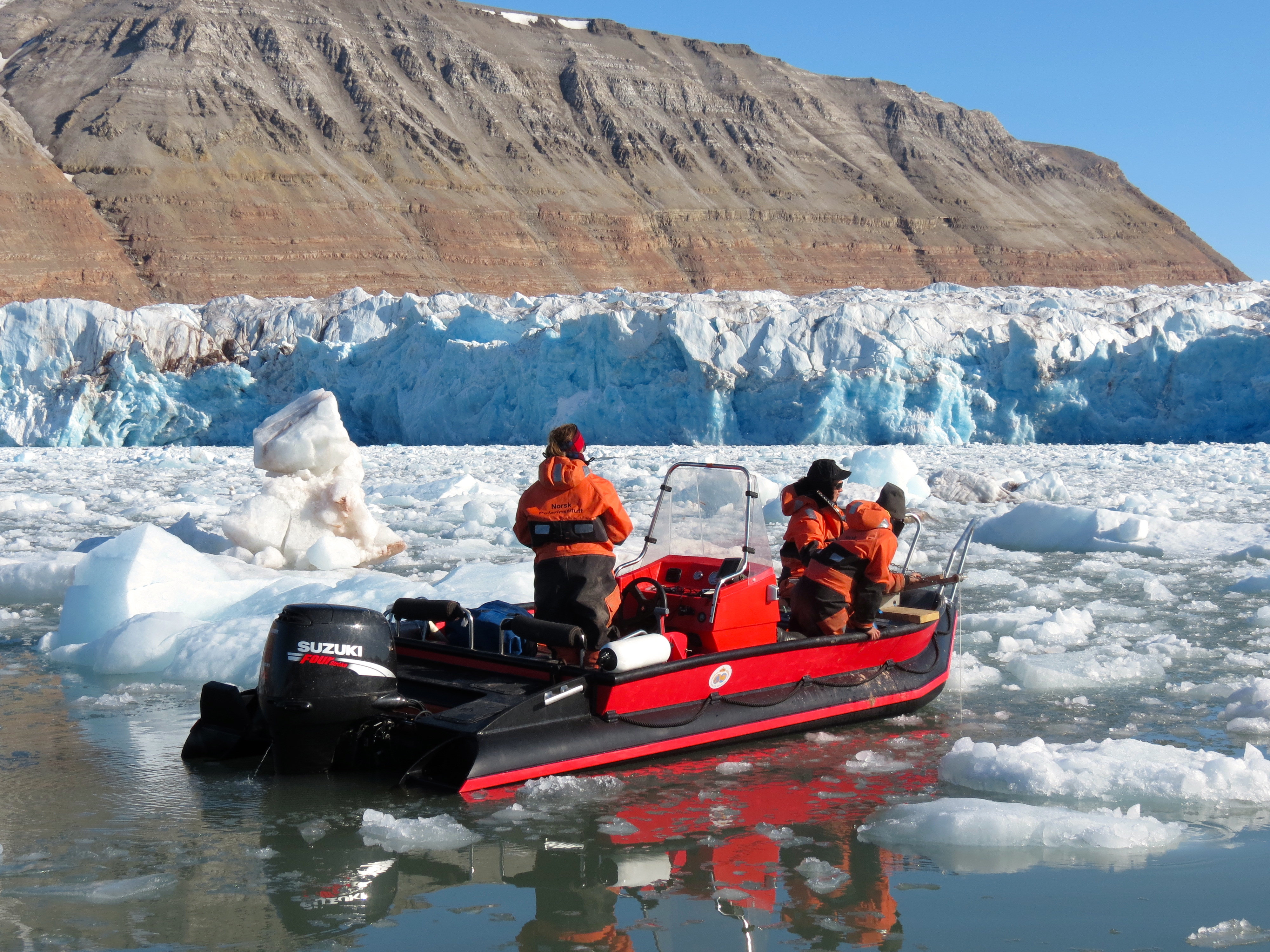 The team gets ready to collect sediment from the ice. Ny Alesund, Svalbard, Norway.