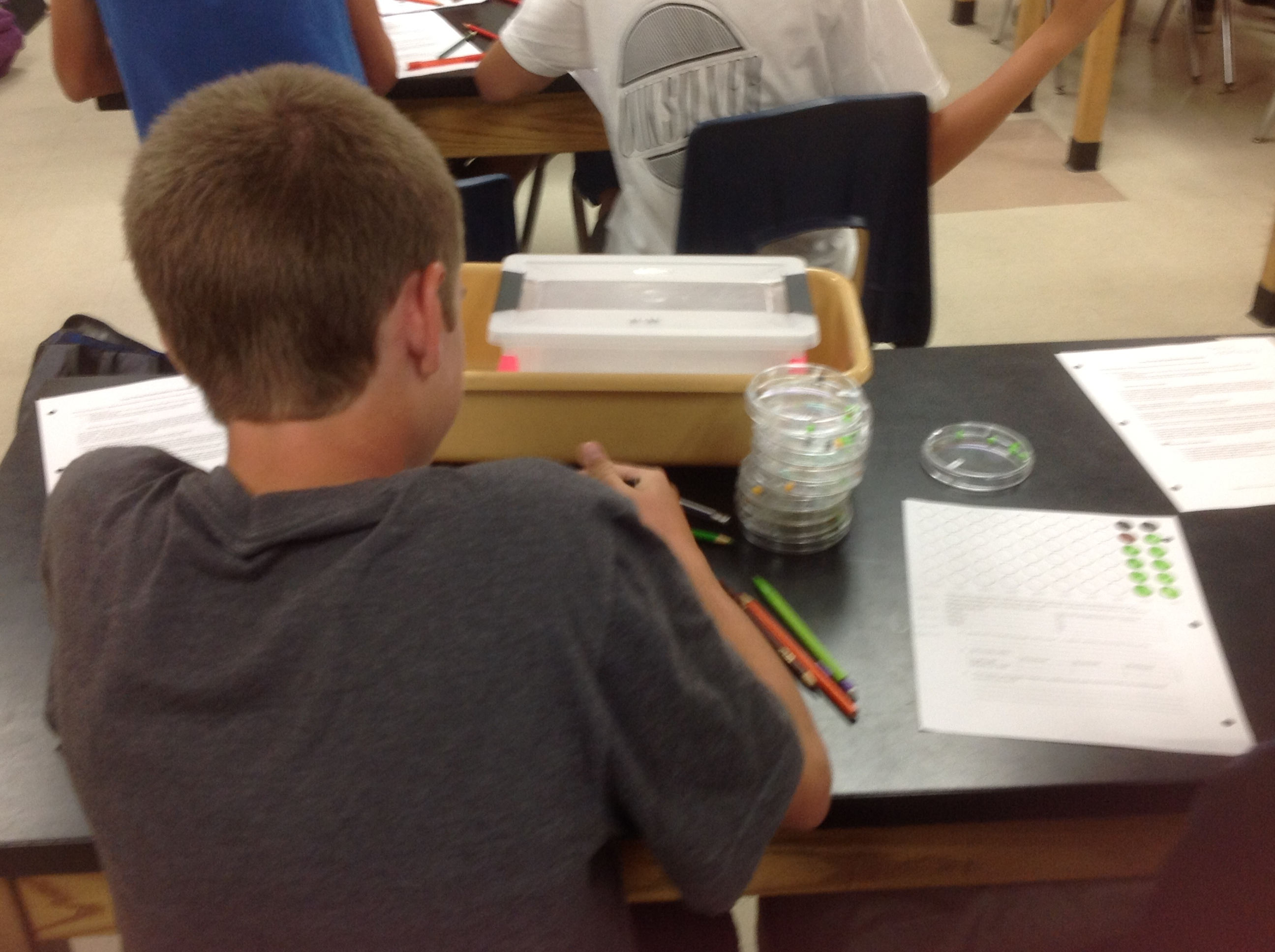Middle school students analyze mock core samples. Colored beads inside "slices of the core" (petri dishes) represent different types of diatoms that are proxies for environmental temperatures. San Diego, California.