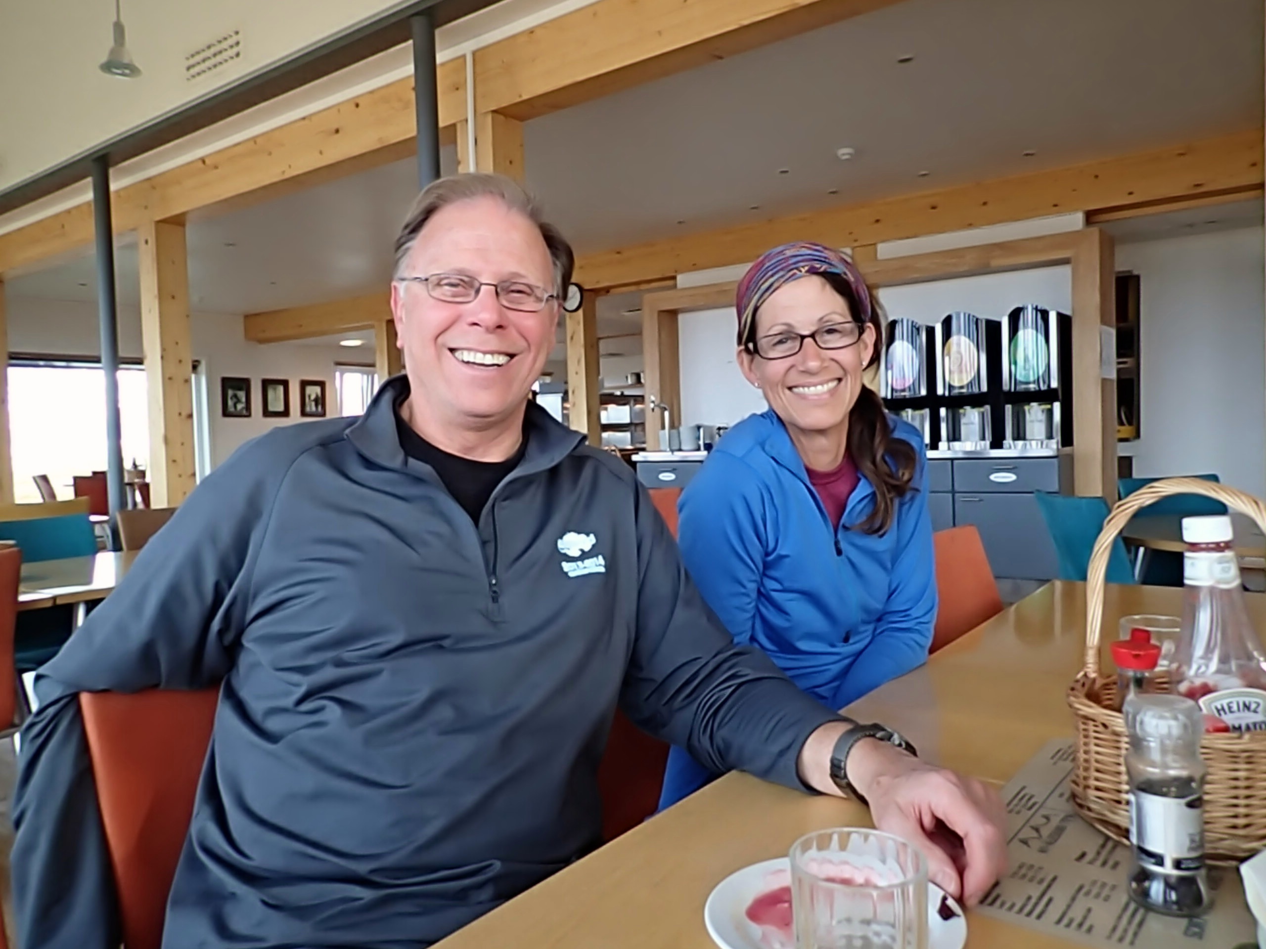 Researcher Ross Powell and Peggy McNeal in the dining hall at the science station relaxing after a full day's work. Ny Alesund, Svalbard, Norway.