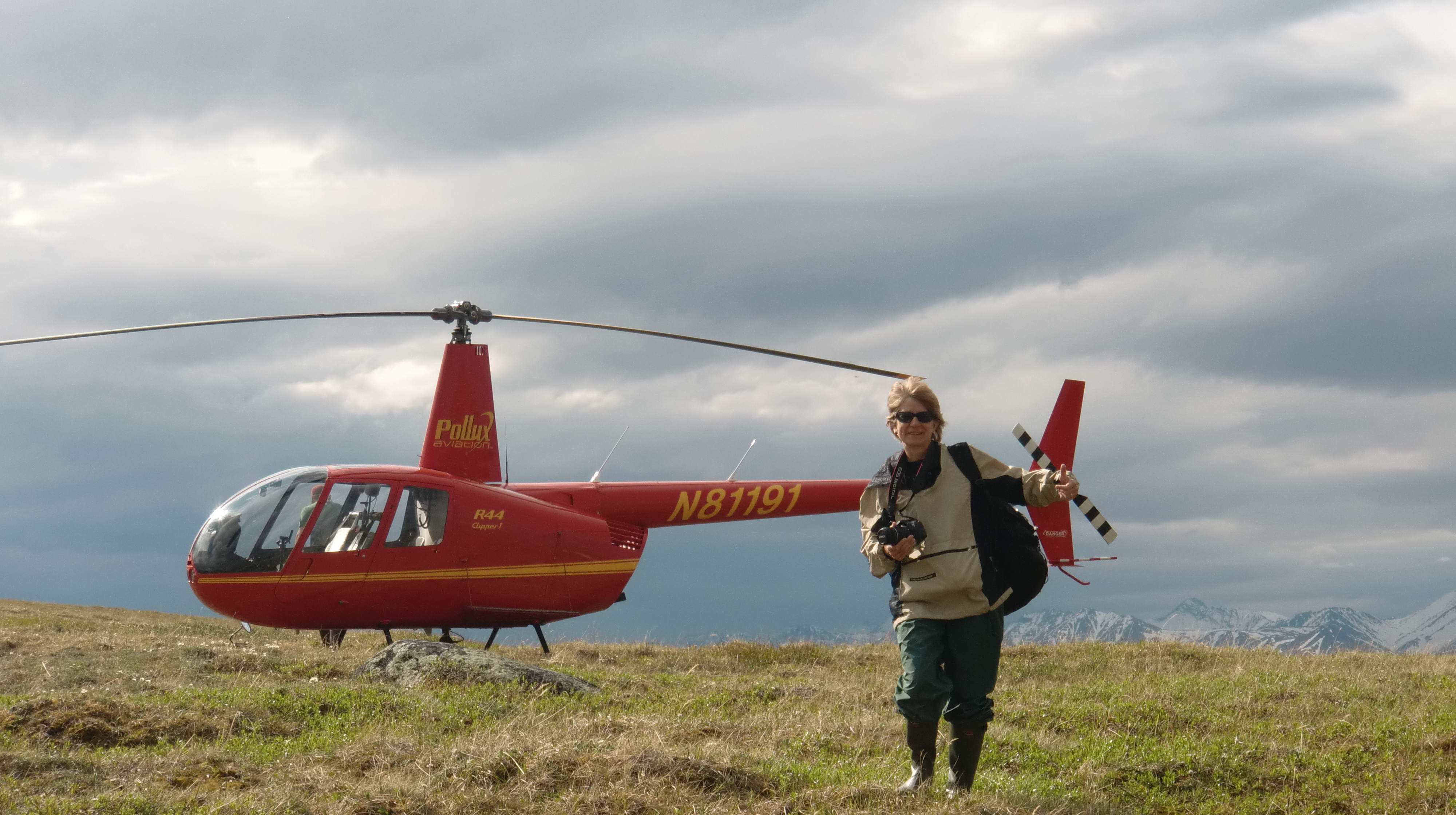 Regina Brinker stands next to a helicopter on the tundra. Toolik Field Station, Alaska.