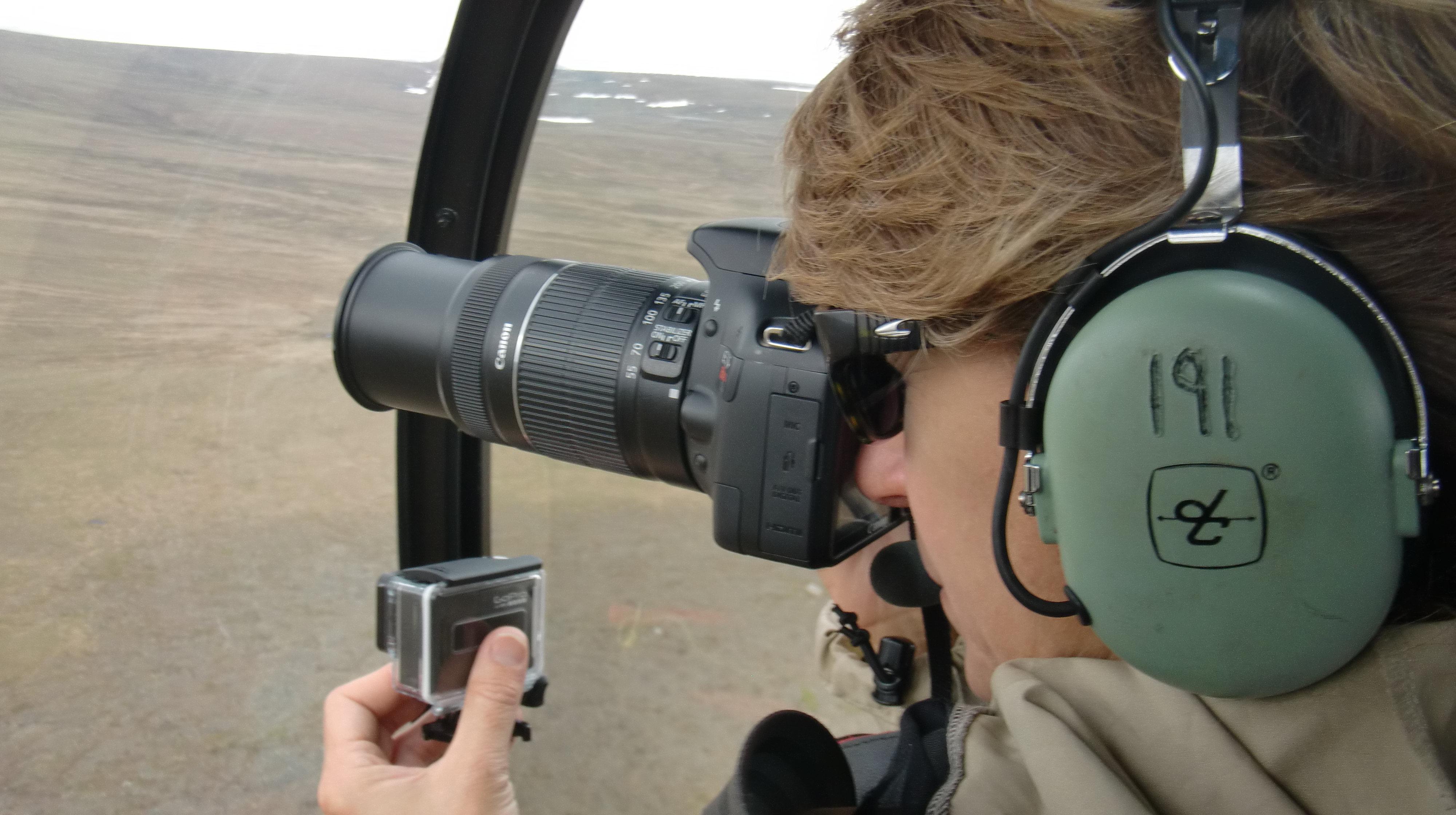 From the helicopter, Regina Brinker photographs the tundra landscape with a DSLR camera and a GoPro video camera. Toolik Field Station, Alaska.