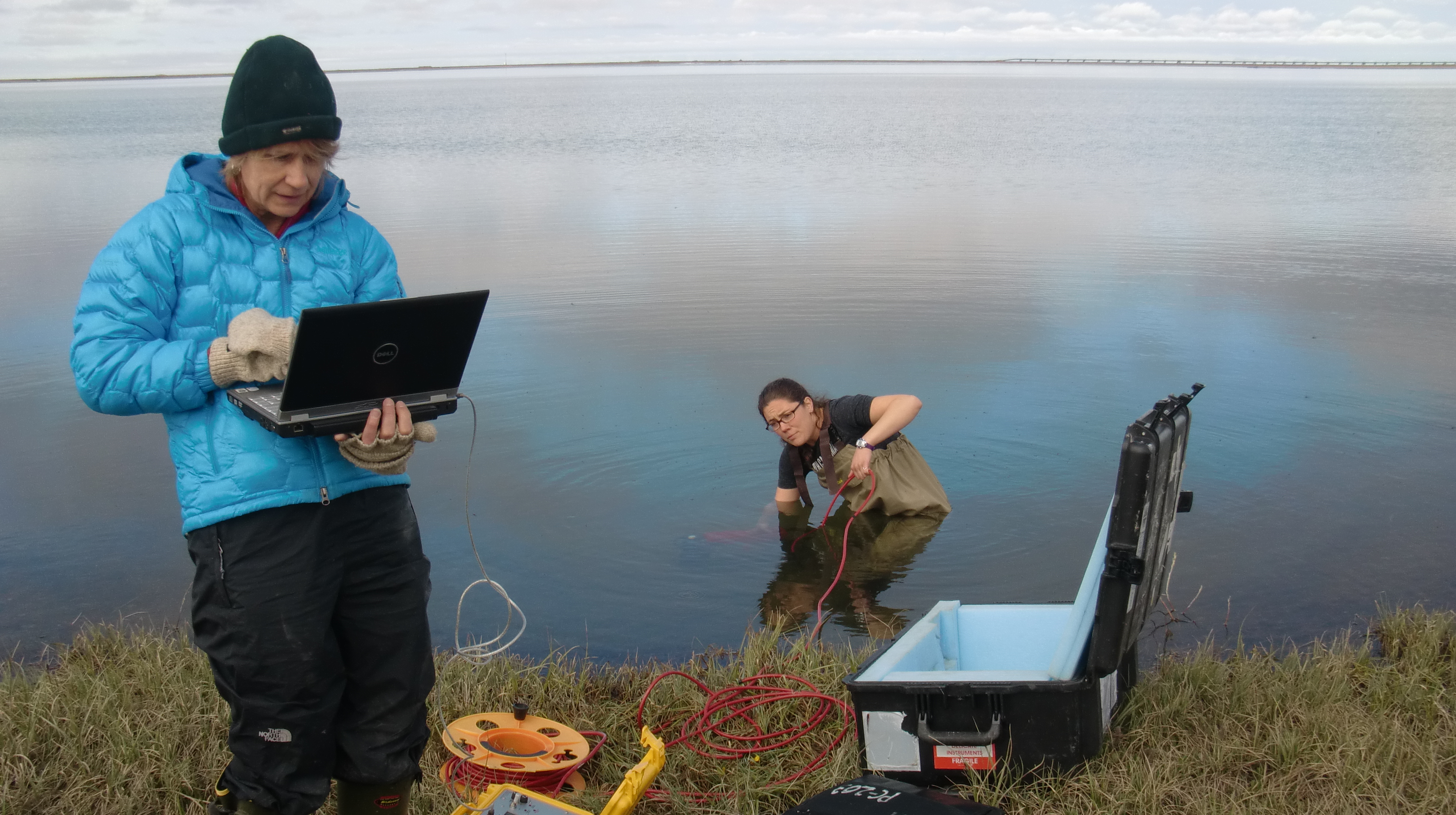 Regina Brinker and Katie Harrold use the C-OPS instrument (Compact-Optical Profiling System) to collect data. Toolik Field Station, Alaska.